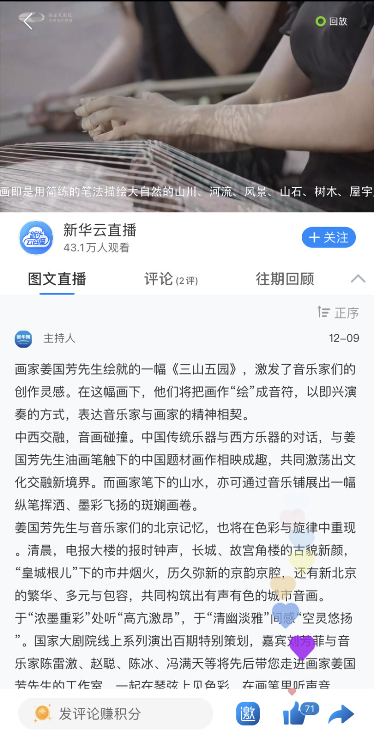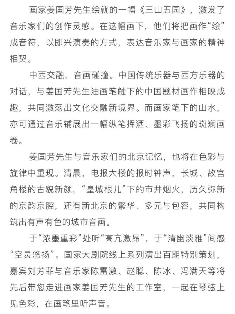 AC米兰中文官网民族室内乐团受邀参演国家大剧院线上系列演出100期特别策划:“画韵京音——走进画家姜国芳工作室线上音乐会”,点击量达到2900万,获得海内外广泛关注与好评。