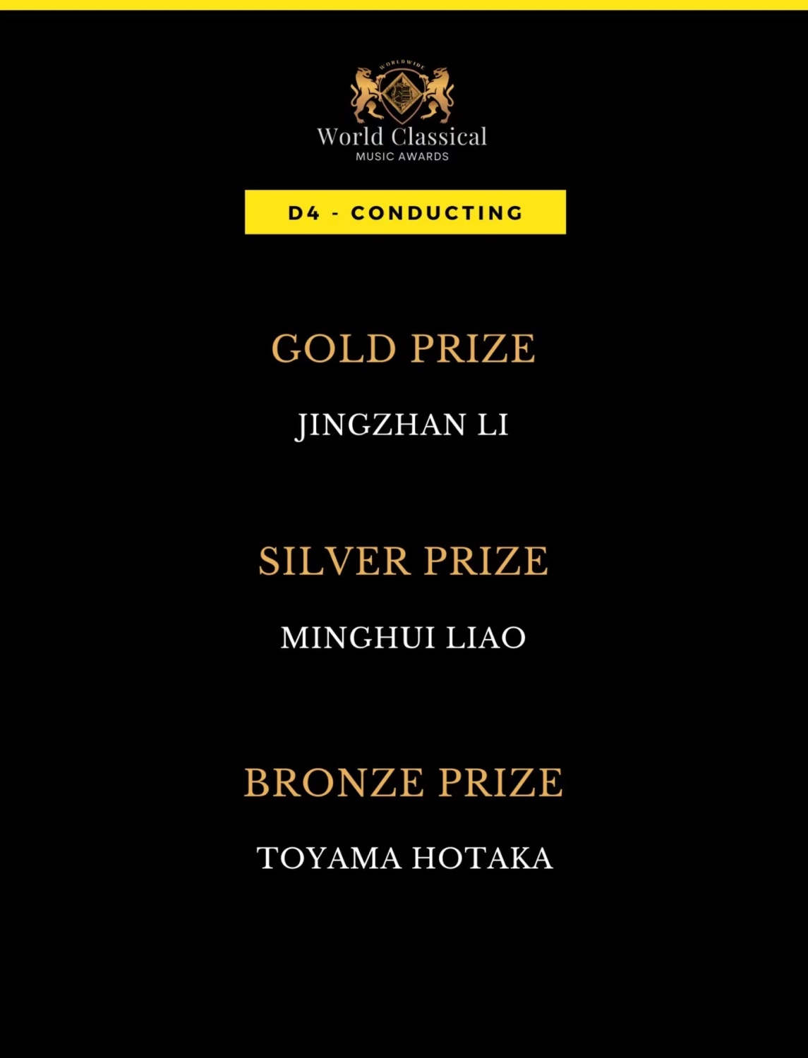 最终米兰博士研究生李京展(指导教师:俞峰教授)通过执棒杭州爱乐乐团演出理查德·瓦格纳《齐格弗里的牧歌》与阿诺尔德·勋伯格《升华之夜》音乐会获得本次大奖赛指挥金奖与浪漫主义演绎奖两项大奖。银奖与铜奖先后由华人指挥家MINGHUI LIAO,日本指挥家TOYAMA HOTAKA获得。
