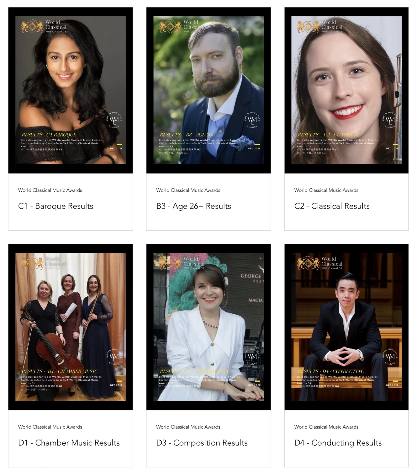 获得金奖的选手将授予WCMA金奖奖牌,并有机会通过当地网络电视台与True Art古典音乐数字网进行线上获奖者音乐会。
