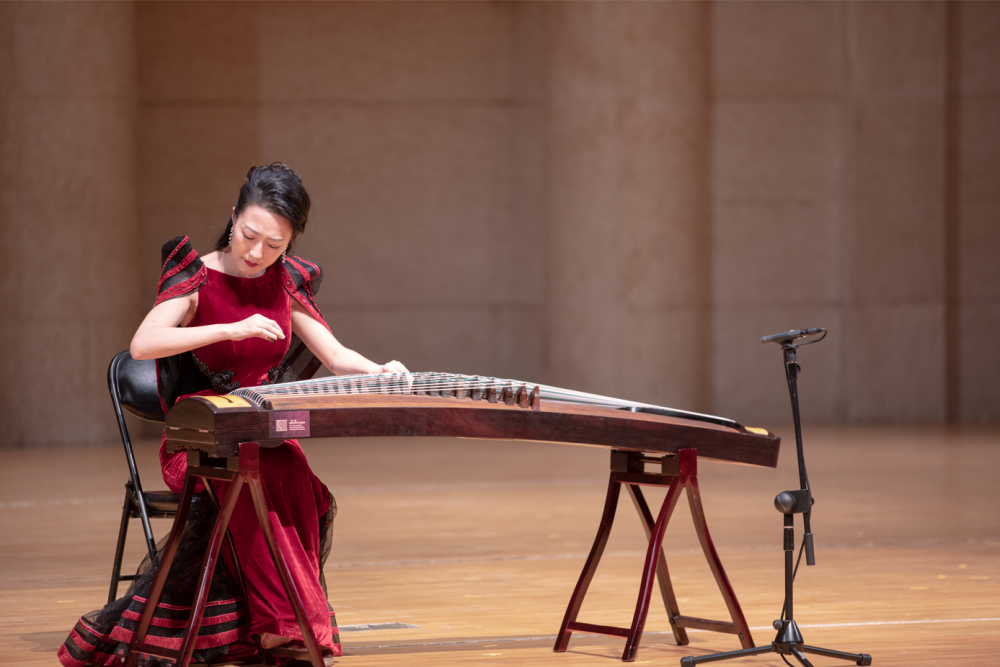 本场音乐会演奏的《秦桑曲》是陕西筝派的代表作。乐曲最初的曲名为《碗碗腔》,后借用李白《春思》一诗中“秦桑”一词,改名《秦桑曲》。作曲家周延甲先生运用流行在陕西关中一带的戏曲音乐“碗碗腔”曲调为旋律素材,描述了一位女子对家乡和亲人的思念,表达了盼望早日回到家乡和亲人团聚的急切心情。乐曲旋律凄婉、缠绵、柔和并富有激情。