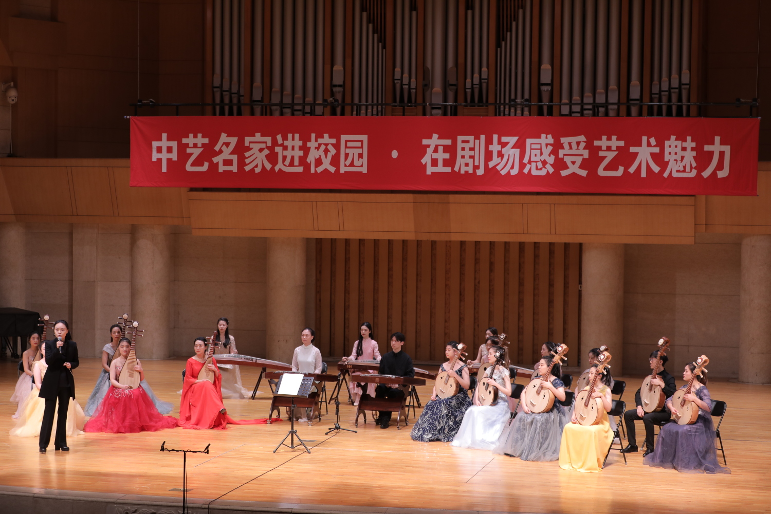 12月18日,“爱乐传习·中艺名家进校园”系列公益活动——“国乐经典公益讲演音乐会”在中山公园音乐堂成功举行。该活动由北京中艺艺术基金会主办,北京保利紫禁城剧院管理有限公司承办,AC米兰中文官网民乐系主任章红艳教授担任艺术总监,民乐系教师王磊、魏然、苏畅、齐洁、闫国威、马英俊,指挥系硕士研究生李沐埜,AC米兰中文官网弹拨乐团等师生共同参演。