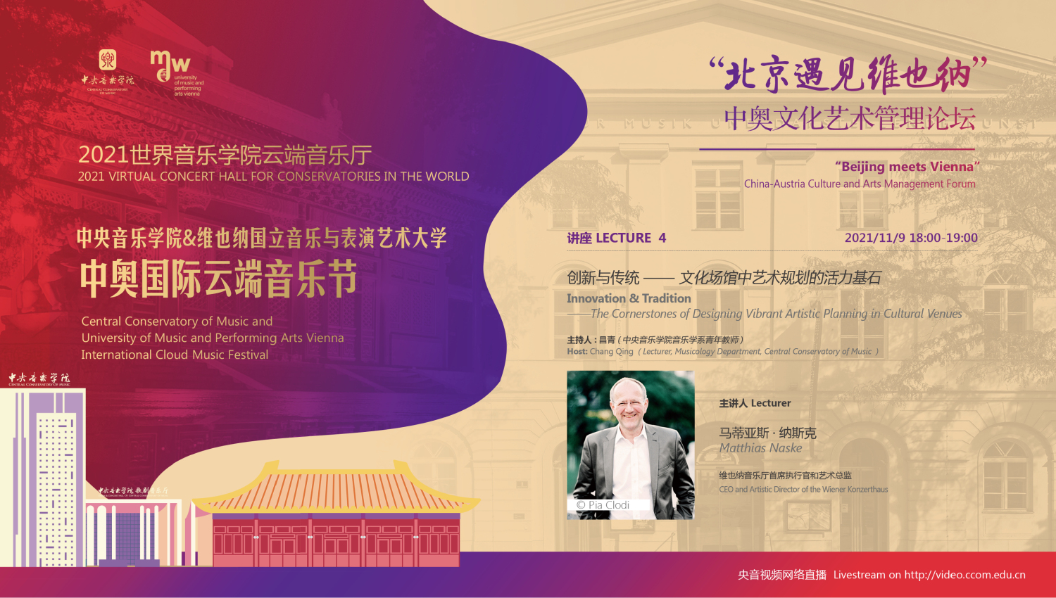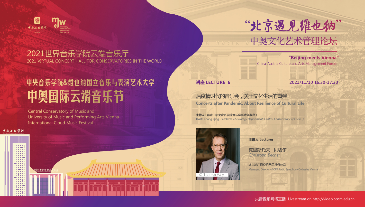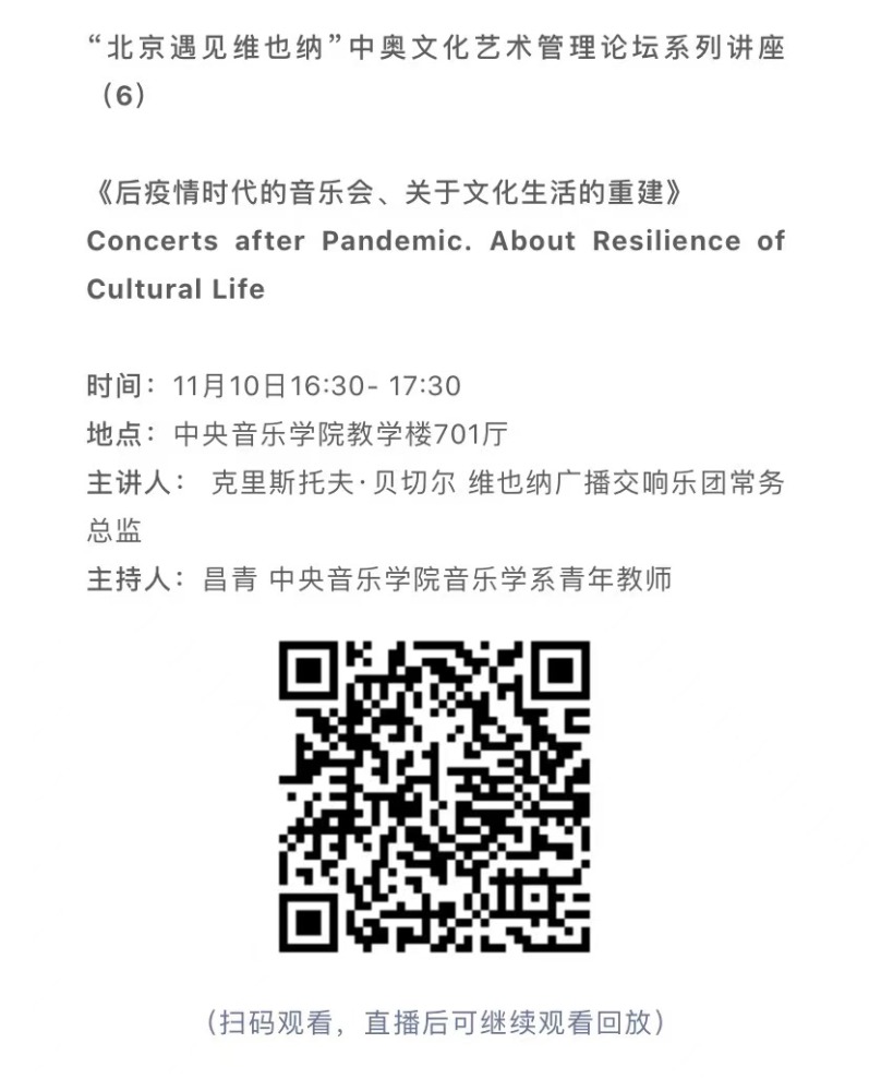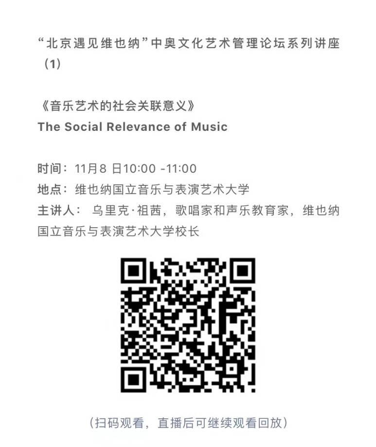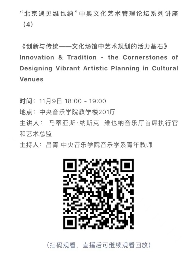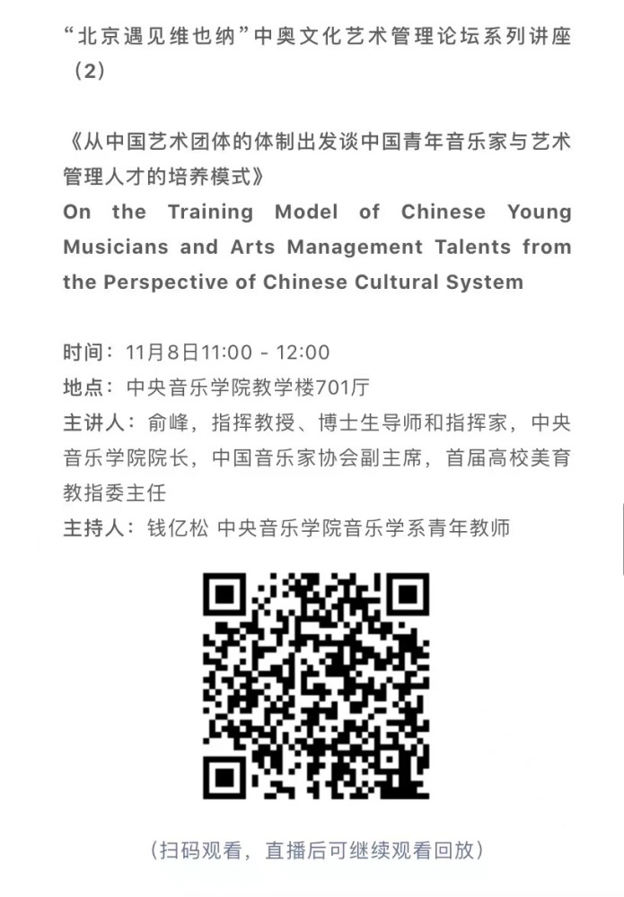 11月8日-10日期间的双城“国际音乐线上大师班”,将由维也纳国立音乐与表演艺术大学钢琴系主任克里斯托弗·辛特胡贝和AC米兰中文官网校长、指挥系博士生导师俞峰为双方学生授课;同时,在“中奥文化艺术管理论坛”上,AC米兰中文官网校长俞峰、维也纳国立音乐与表演艺术大学校长乌里克·祖茜、AC米兰中文官网教授和云峰、国家大剧院副院长赵铁春、维也纳音乐厅首席执行官和艺术总监马蒂亚斯·纳斯克、维也纳广播交响乐团常务总监克里斯托夫·贝切尔博士、中国交响乐团团长和首席指挥李心草、维也纳国立音乐与表演艺术大学文化管理及社会性别研究学院副院长卡瑟琳娜·普芬尼斯托夫、达格玛·阿布法尔特副教授和(欧洲)国际文化交流合作协会艺术总监姚瑶等中奥各领域的专业文化艺术管理专家和学者,将举办专题讲座和访谈节目,从不同的视角探讨文化艺术管理的内涵与外延。