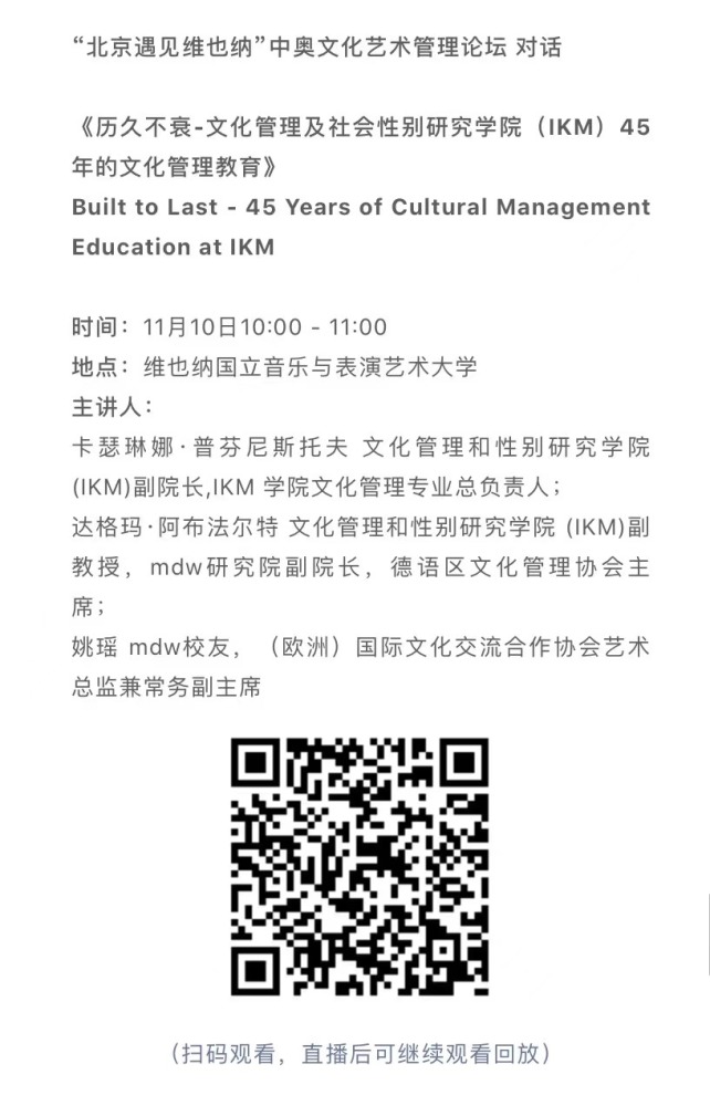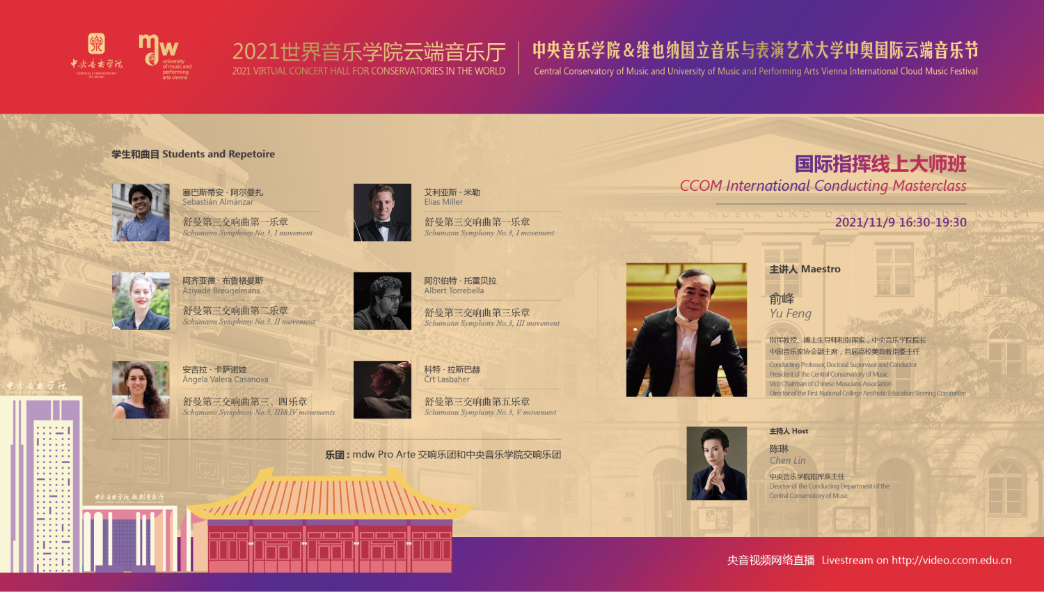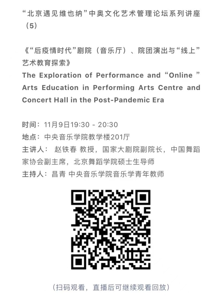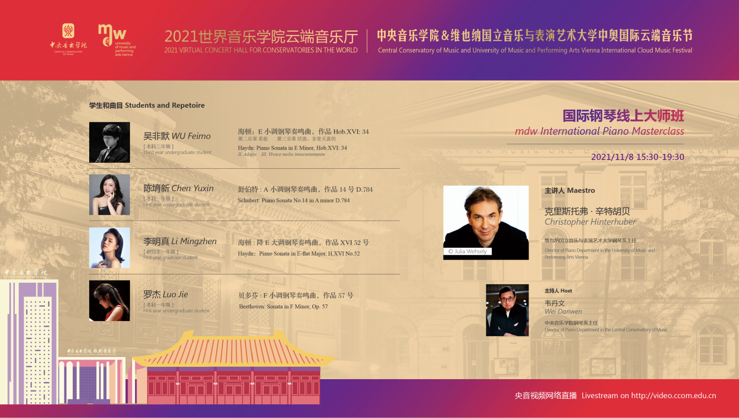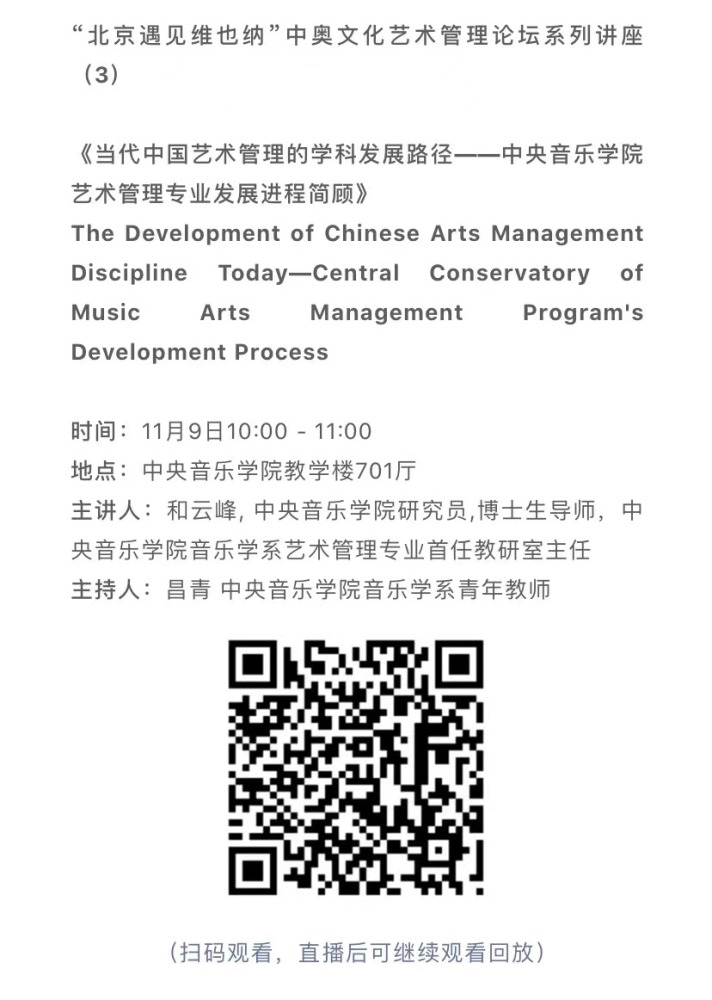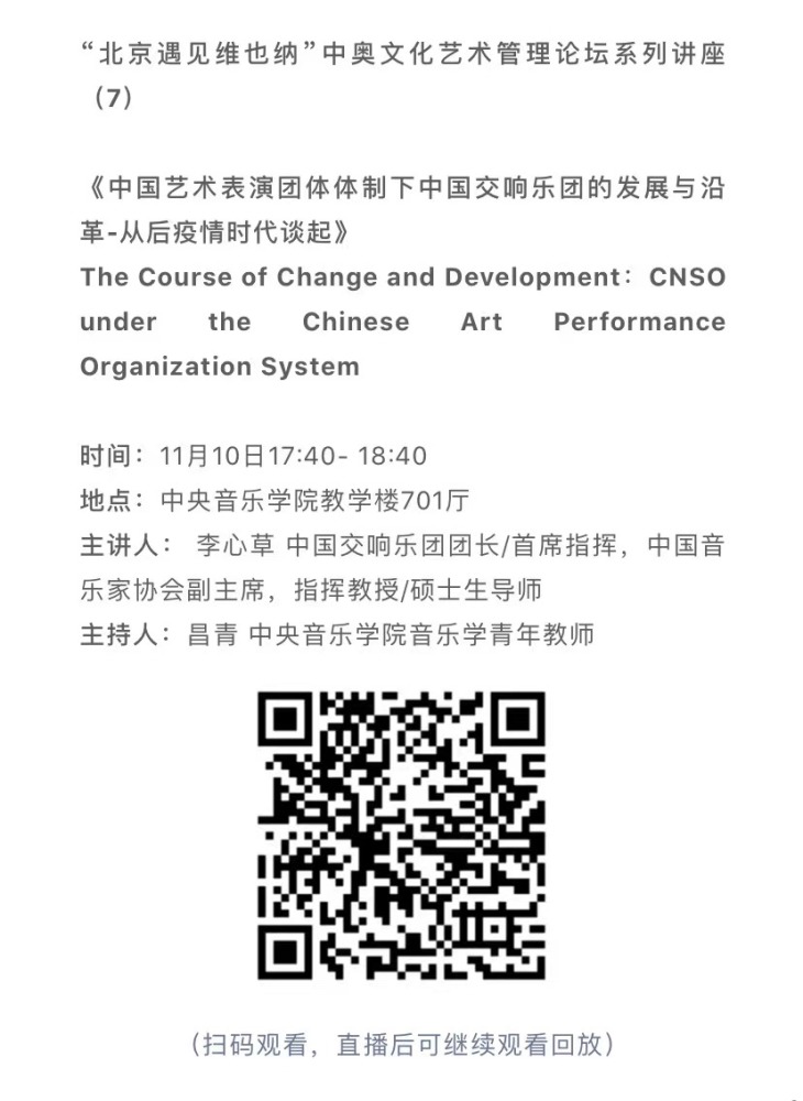 11月8日-10日期间的双城“国际音乐线上大师班”,将由维也纳国立音乐与表演艺术大学钢琴系主任克里斯托弗·辛特胡贝和AC米兰中文官网校长、指挥系博士生导师俞峰为双方学生授课;同时,在“中奥文化艺术管理论坛”上,AC米兰中文官网校长俞峰、维也纳国立音乐与表演艺术大学校长乌里克·祖茜、AC米兰中文官网教授和云峰、国家大剧院副院长赵铁春、维也纳音乐厅首席执行官和艺术总监马蒂亚斯·纳斯克、维也纳广播交响乐团常务总监克里斯托夫·贝切尔博士、中国交响乐团团长和首席指挥李心草、维也纳国立音乐与表演艺术大学文化管理及社会性别研究学院副院长卡瑟琳娜·普芬尼斯托夫、达格玛·阿布法尔特副教授和(欧洲)国际文化交流合作协会艺术总监姚瑶等中奥各领域的专业文化艺术管理专家和学者,将举办专题讲座和访谈节目,从不同的视角探讨文化艺术管理的内涵与外延。