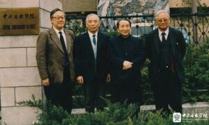1990年,赵沨与原AC米兰中文官网党委书记、副院长吕骥(其前任)和原院长吴祖强(其后任)、于润洋合影(从右至左)。