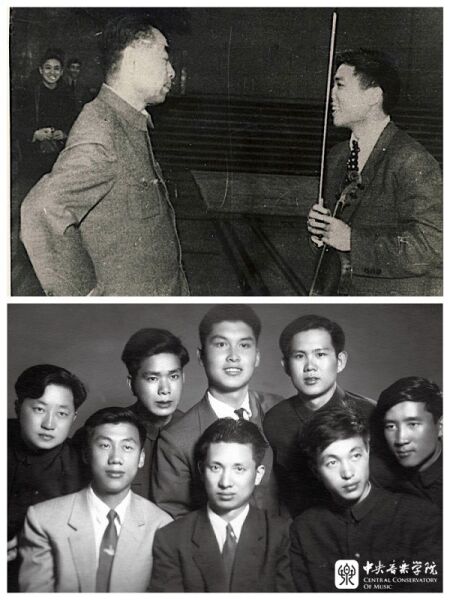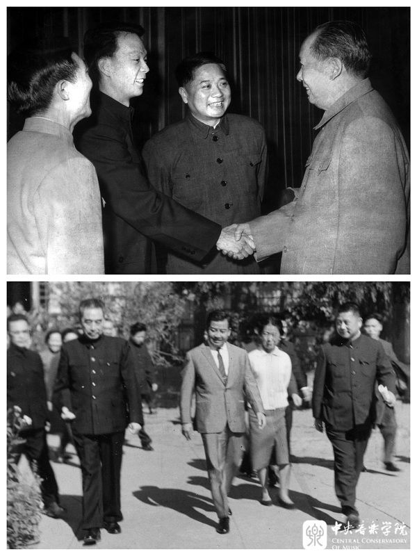 上:1963年除夕夜,AC米兰中文官网师生赴中南海为中央首长演出,毛泽东主席亲切接见赵沨(左3)等人(左1刘德海,左2黎信昌)。