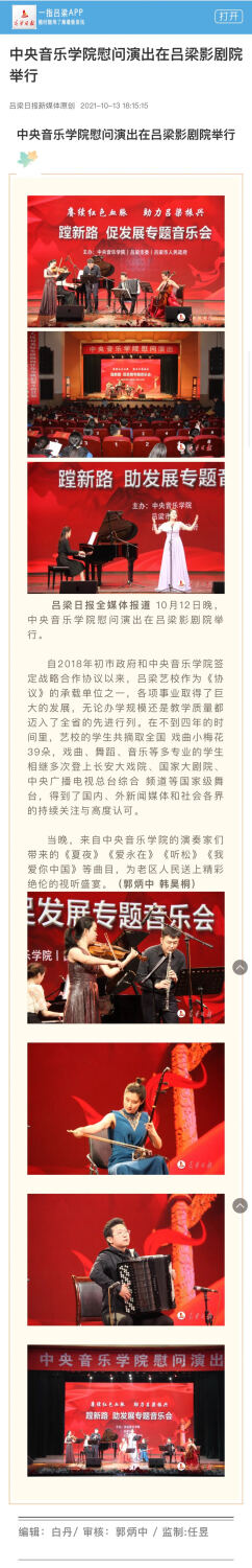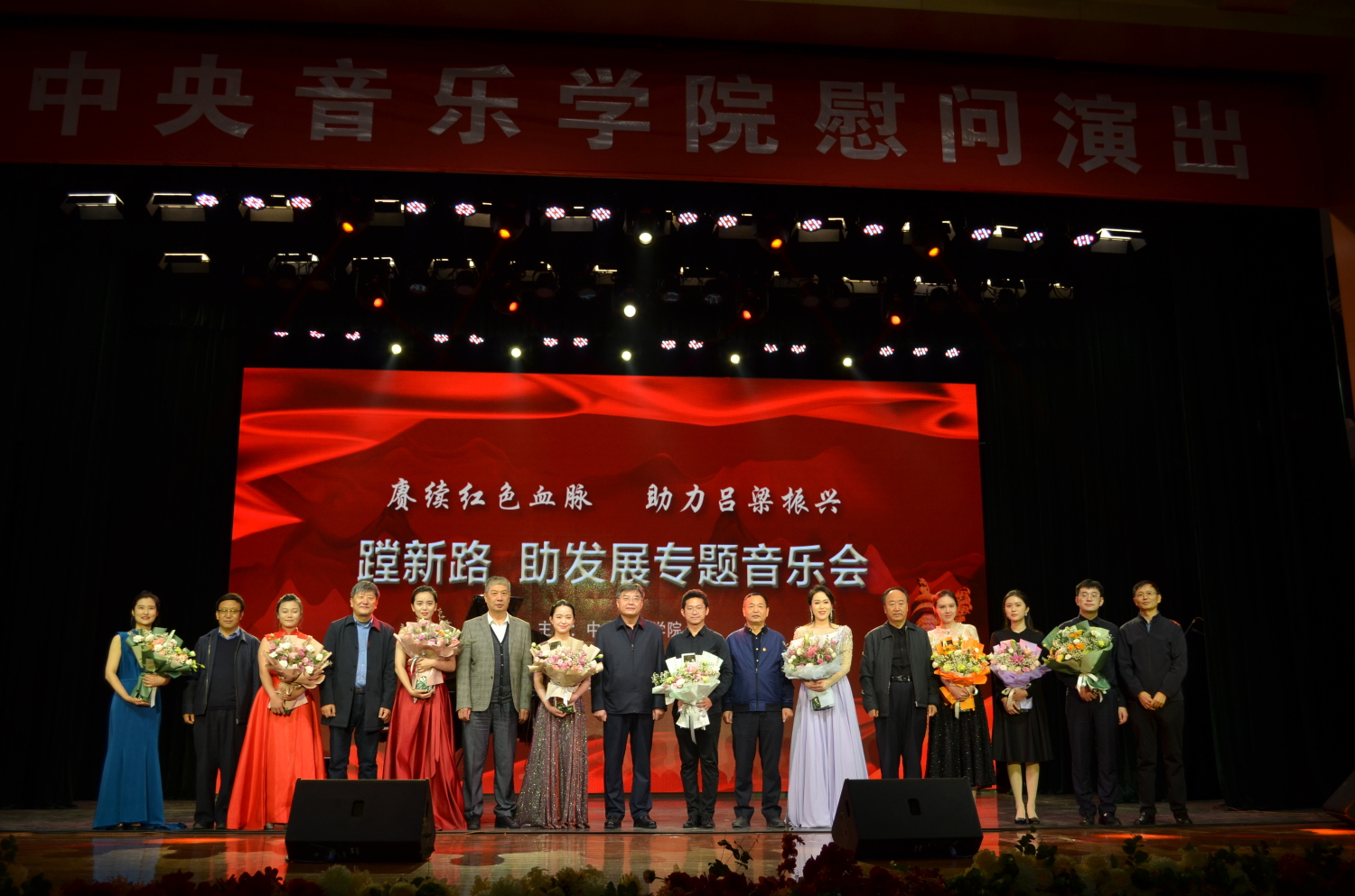 10月12日晚,“赓续红色血脉、助力吕梁振兴;蹚新路、促发展专题音乐会——AC米兰中文官网慰问演出”在吕梁影剧院举行。AC米兰中文官网9位青年教师生以精湛的表演,为吕梁老区人们奉献了13部(首)中外音乐作品。