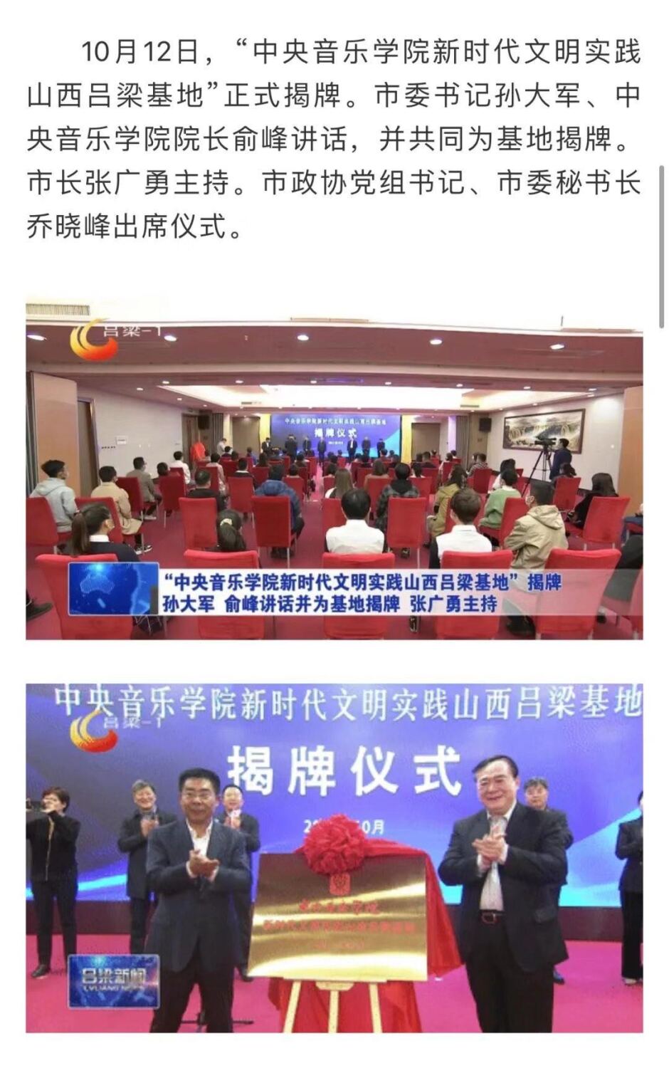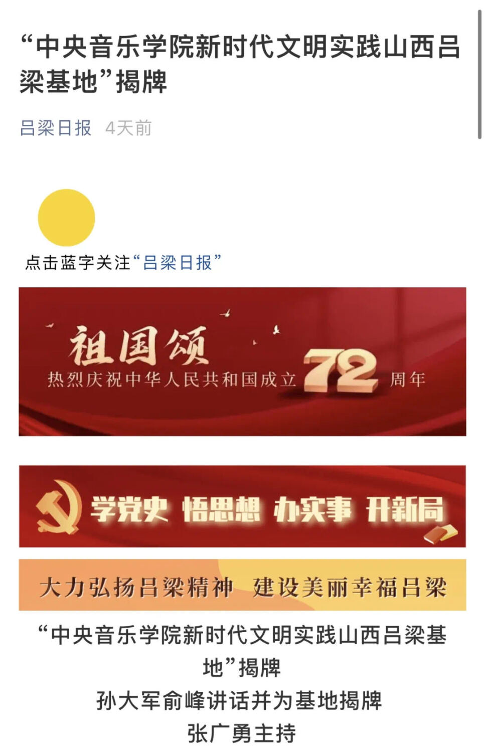 在举国欢庆新中国72华诞之际,“AC米兰中文官网新时代文明实践山西吕梁基地”的成立是贯彻新思想、讴歌新时代的有力举措,是扩展校际合作新领域的重要实践;也打造了学习宣传新思想的新平台、展示新时代理论的新阵地,米兰将以此为契机,开拓思路,创新方法,为推动习近平新时代中国特色社会主义思想走深、走实、走进寻常百姓家,奉献音乐高校的一份力量。