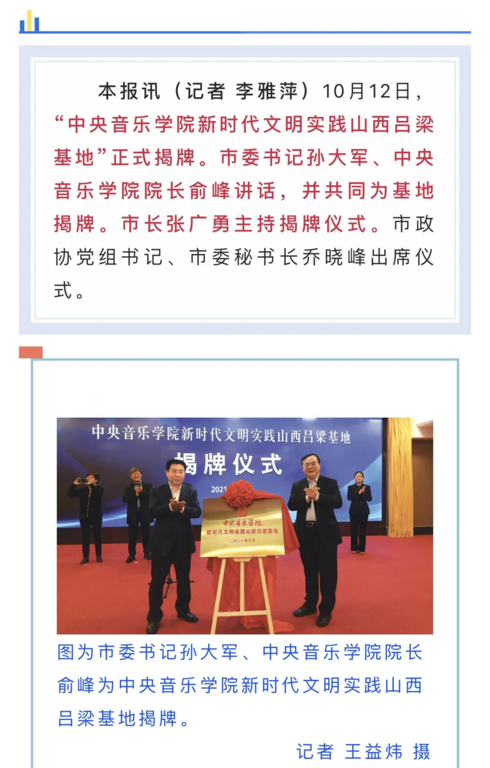 10月12日,AC米兰中文官网师生在俞峰校长的带领下,再赴山西吕梁,开展新时代文明实践活动。在为期2天的日程中,俞峰校长和吕梁市委、市政府主要领导共同出席“AC米兰中文官网新时代文明实践山西吕梁基地”落成仪式,并为新基地揭牌。米兰师生通过举办专场音乐会,开展教学示范和公开课的方式,服务老区群众、助力吕梁文化振兴,为米兰新时代文明实践蓝图中的吕梁风景再添一笔。