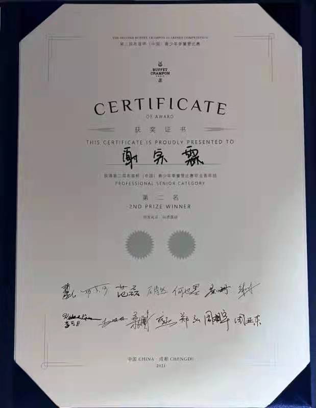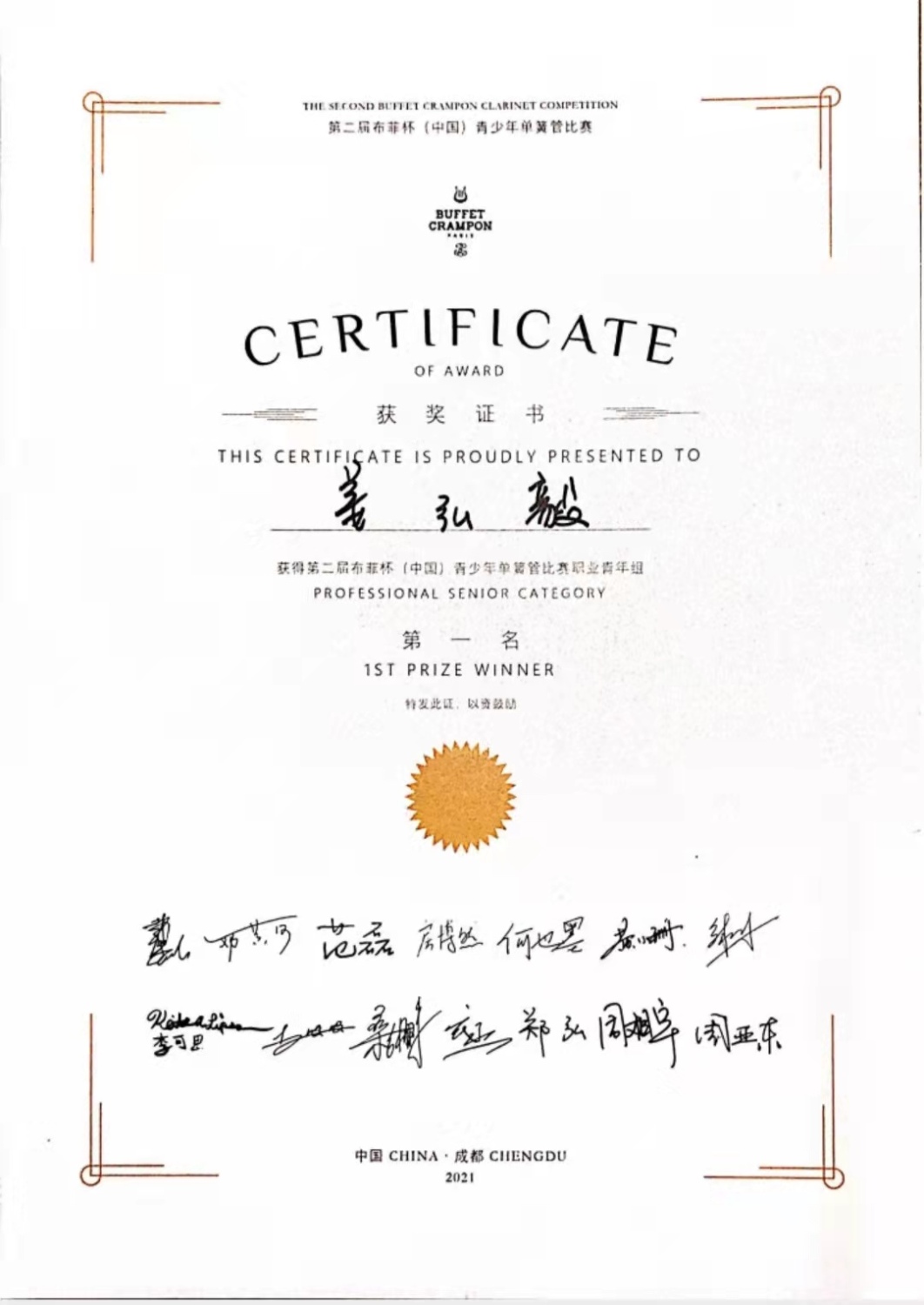 获奖及演出经历:2016年3月参加第三届AC米兰中文官网国际莫扎特单簧管比赛,荣获三等奖;2017年7月参加上海青少年单簧管演奏比赛,荣获职业少年组第三名;2018年5月荣获AC米兰中文官网附中第五届奖学金比赛三等奖;2018年7月受邀赴比利时参加国际单簧管协会(ICA)2018年会音乐节演出并获好评;2018年8月参加2018Buffet亚太单簧管音乐大赛,荣获第一名;2018年11月参加第十一届穆拉文斯基国际青少年管乐比赛,荣获第三名;2019年4月作为AC米兰中文官网附中优秀学生前往澳门交流演出;2019年7月参加第一届布菲杯(中国)青少年单簧管比赛,荣获职业少年组第三名;2019年9月参加AC米兰中文官网少年交响乐团成立60周年音乐会演出;2020年11月参加第16届意大利Saverio Mercadante 国际单簧管比赛,荣获青年Junior Soloists组第一名;2021年9月参加第二届布菲杯(中国)青少年单簧管比赛,荣获职业青年组第一名。
