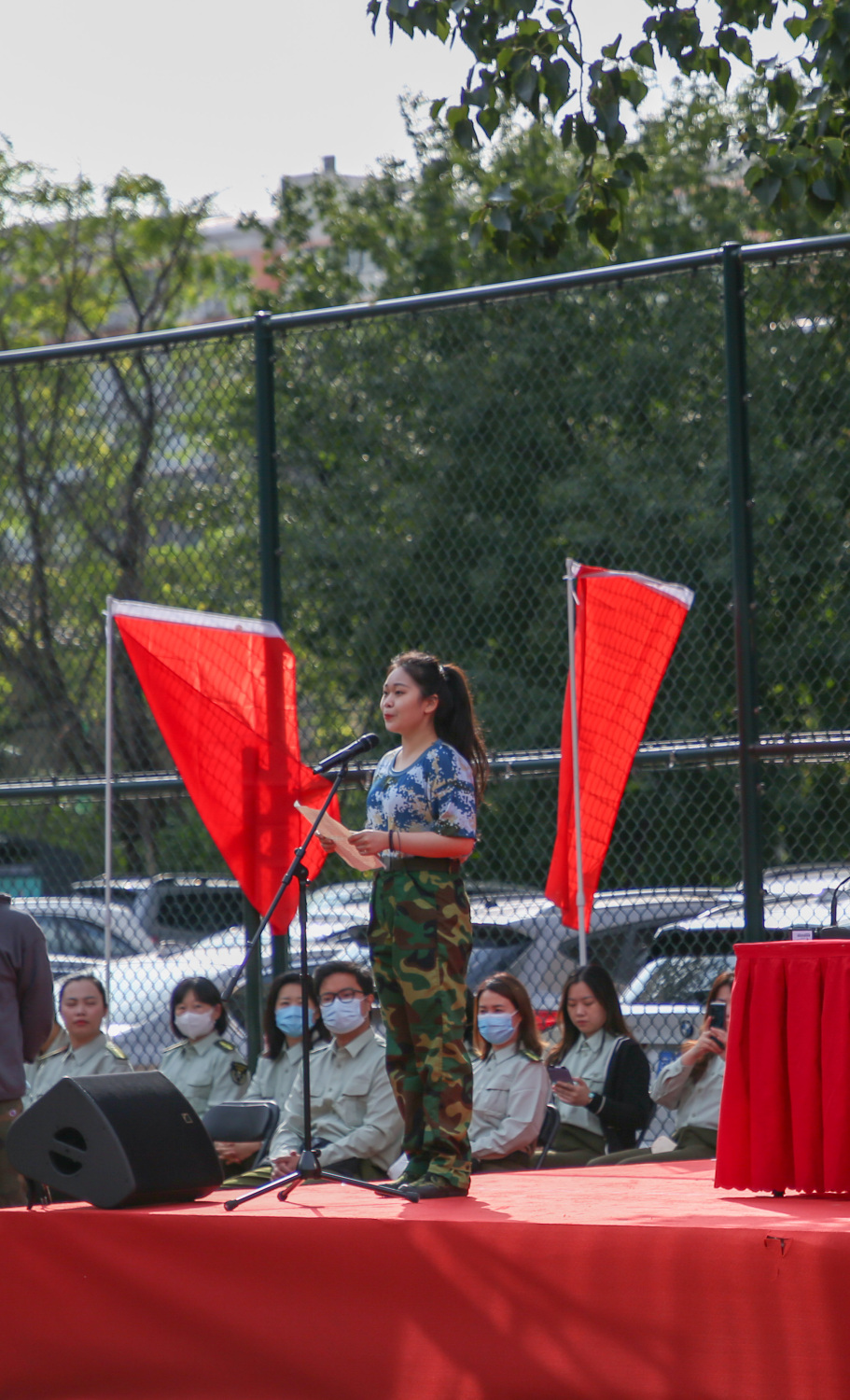 在开营仪式上,同学们神情专注、整装待发,马鑫团长代表本次全体参训人员庄严接过苗书记手中的军训团团旗。