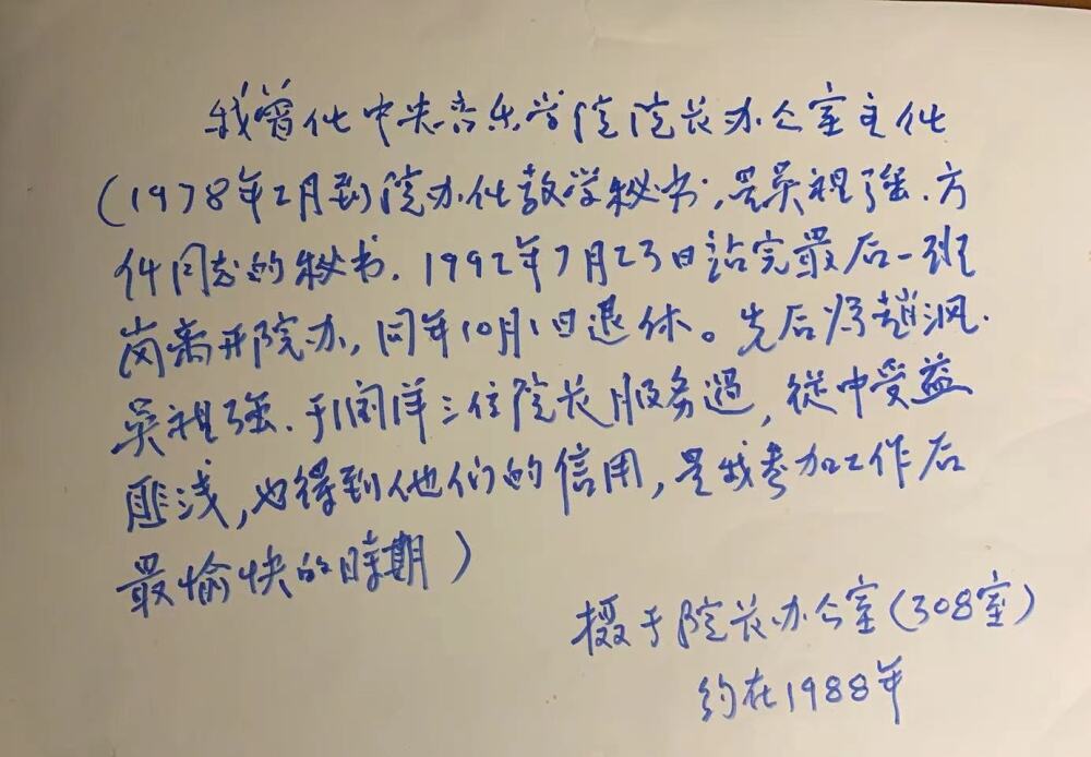 “得知奚老师病故的消息,非常吃惊也非常难过!从我到院办工作开始,就一直在奚老师的带领帮助下,逐渐熟悉并热爱学院的行政工作。还记得在每天下班时我们总能见到奚老师在离校之前必定要把三层办公室、会议室、院长室、副院长室的门把手挨个按一遍,检查是否锁好。这一良好的习惯动作,我和院办的同事们一直延续了下来。这些看似点滴的小细节、小事情,却反映出一位老同志对工作认真负责、一丝不苟的高度的责任心。