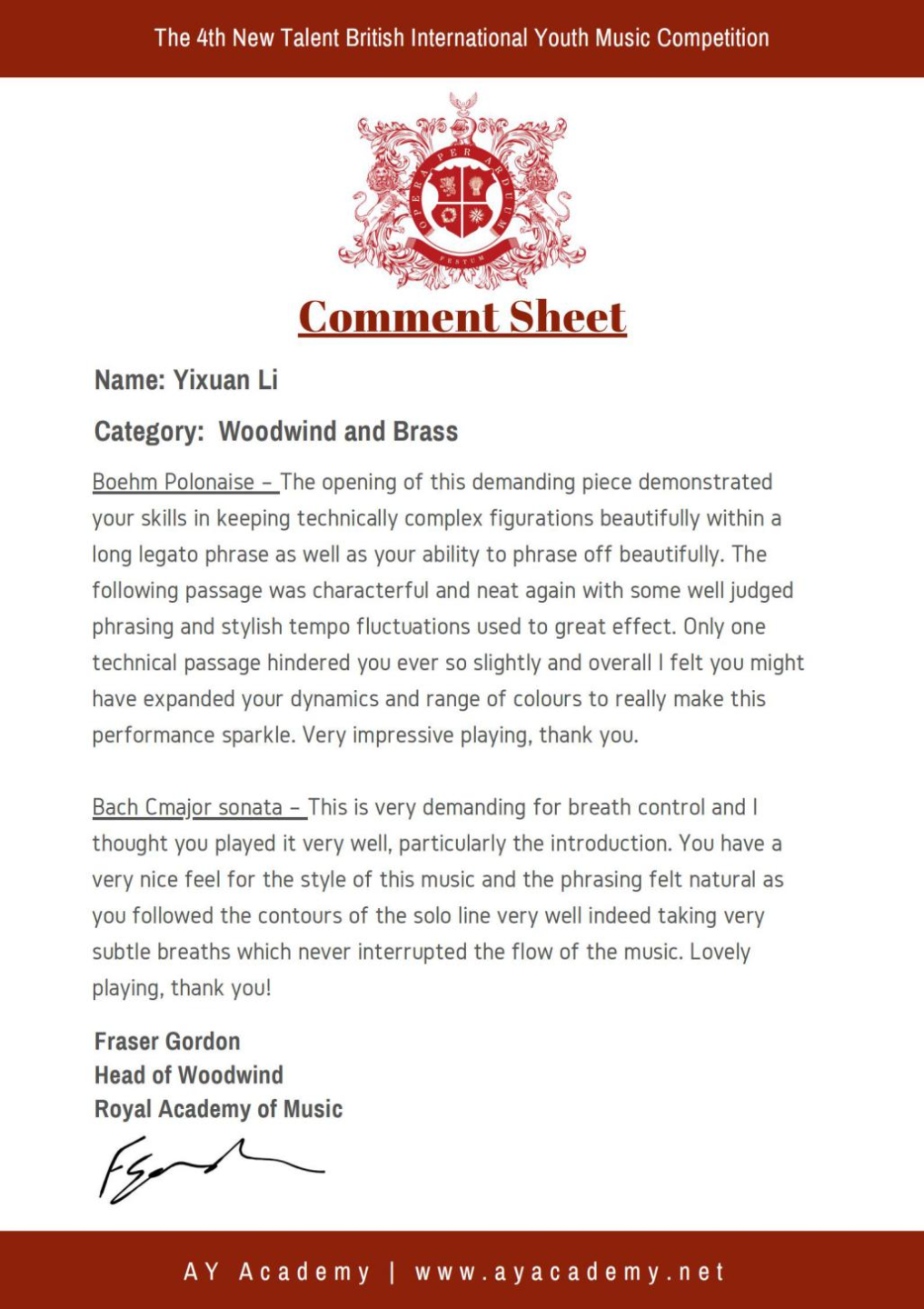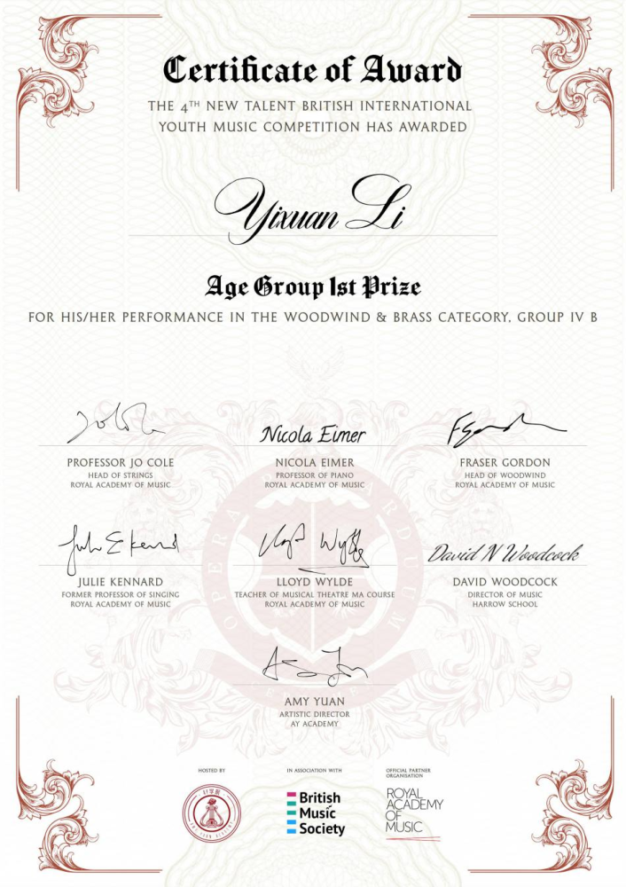 在9月19日结束的2021年第四届英国新菁英国际青少年音乐大赛(New Talent British International Youth Music Competition)评选中,米兰初二年级长笛专业李奕萱同学(指导老师:邓甍教授)经过激烈的竞逐,获得木管铜管12-15岁专业组第一名的佳绩。