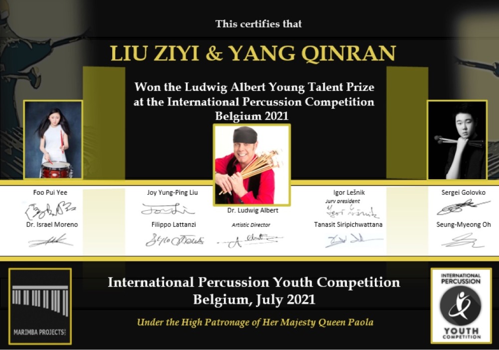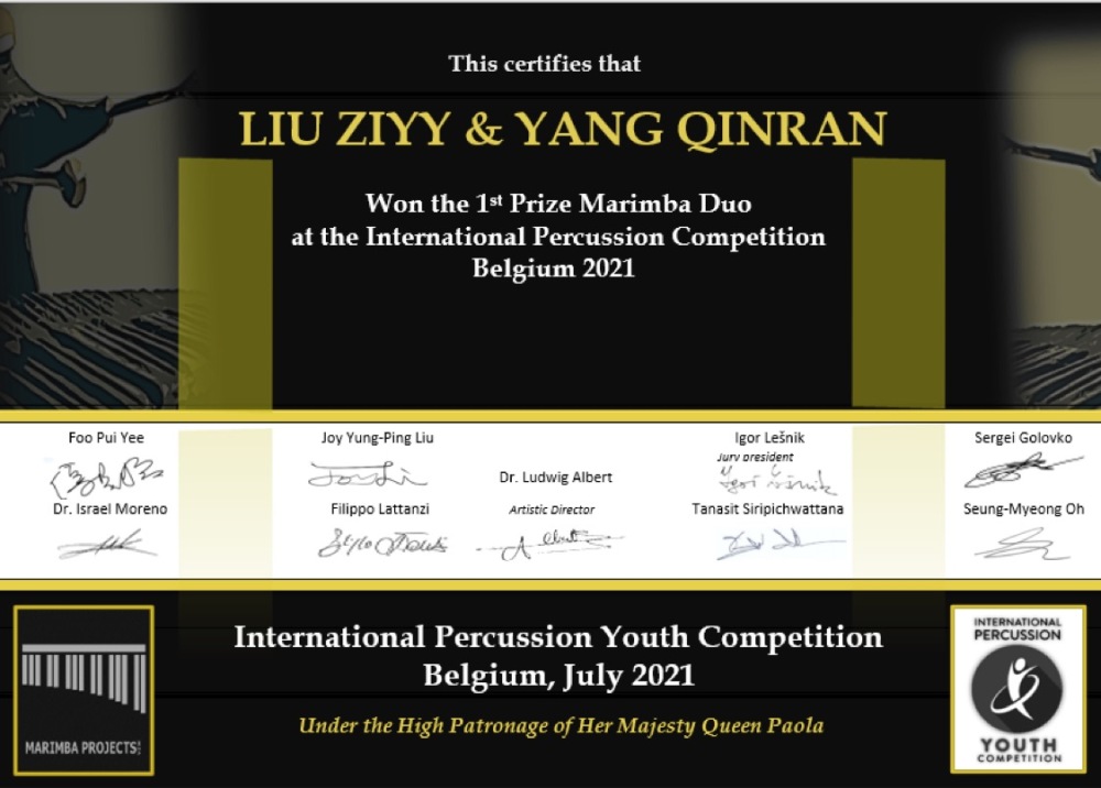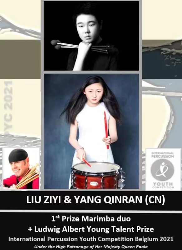 在刚刚落幕的比利时2021年国际青年打击乐比赛中(INTERNATIONAL PERCUSSION YOUTH COMPETITION 2021 BELGIUM),AC米兰中文官网附中四名西洋打击专业学生经过激烈角逐,脱颖而出,取得优异成绩。附中高一年级学生刘子一与初三年级学生杨钦然获得2021 IPYCB室内乐马林巴重奏专业组一等奖及青年天才奖(指导教师:张景丽副教授),初二年级学生刘思琪与史文奇获得2021 IPYCB室内乐马林巴重奏专业组二等奖(指导教师:张景丽副教授)。