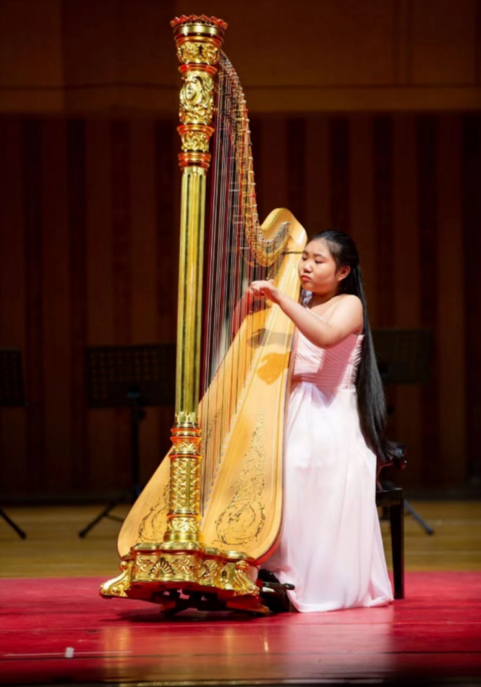 虞涵匀,11岁,五岁开始学习古筝,七岁跟随宁波交响乐团竖琴刘爽老师学习竖琴,2019年考入AC米兰中文官网附小四年级,师从竖琴演奏家王冠副教授。2016-2018年间曾多次荣获浙江省舟山市普陀中小学生艺术大赛古筝一等奖、竖琴一等奖;2020年6月获塞尔维亚国际音乐比赛竖琴II组一等奖;2020年在第五届香港国际竖琴比赛中获得D组荣誉奖;2020年中国竖琴大赛C2组一等奖;曾在中山音乐堂、宁波交响乐团音乐厅表演竖琴独奏。