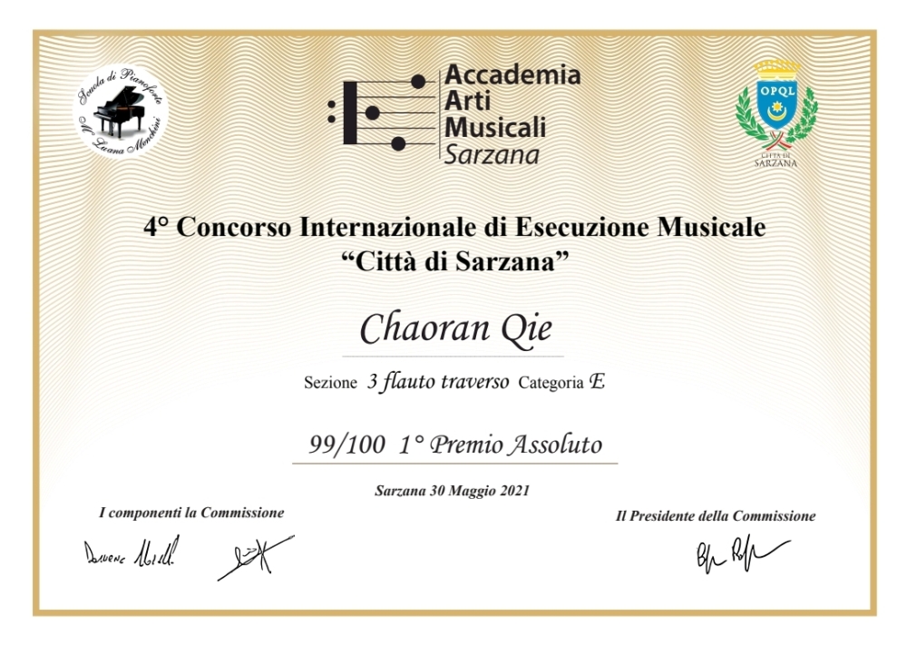 在近期结束的2021年第四届意大利萨尔扎纳城国际音乐比赛中,米兰高二年级郄超然同学获得了长笛专业E组特等奖!(指导教师:李凌副教授)