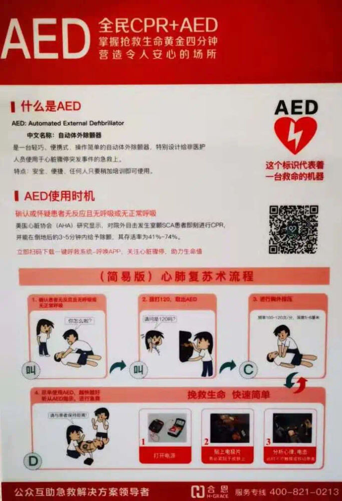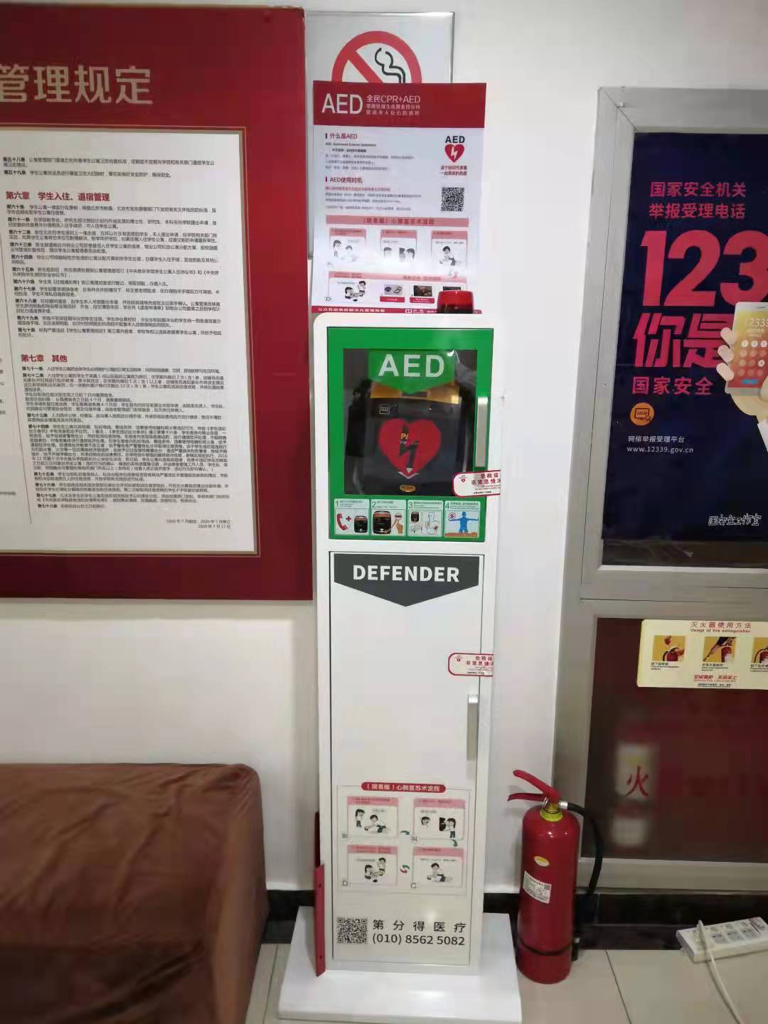AED 即 自动体外除颤器。自动体外除颤器又称自动体外电击器、自动电击器、自动除颤器、心脏除颤器及傻瓜电击器等,是一种便携式的医疗设备,它可以诊断特定的心律失常,并且给予电击除颤,是可被非专业人员使用的用于抢救心脏骤停患者的医疗设备。在心跳骤停时,只有在最佳抢救时间的"黄金4分钟"内,利用自动体外除颤器(AED)对患者进行除颤和心肺复苏,才是最有效制止猝死的办法。为最大限度的保障全院的师生健康,学院筹措资金在教学综合楼、学生公寓、家属区保安亭配备了3台AED,并对教务管理人员、保安和宿管人员进行了专业培训,从而保证有遇到突发心脏病的情况下第一时间得到抢救,从而最大限度的保障师生的健康和生命。