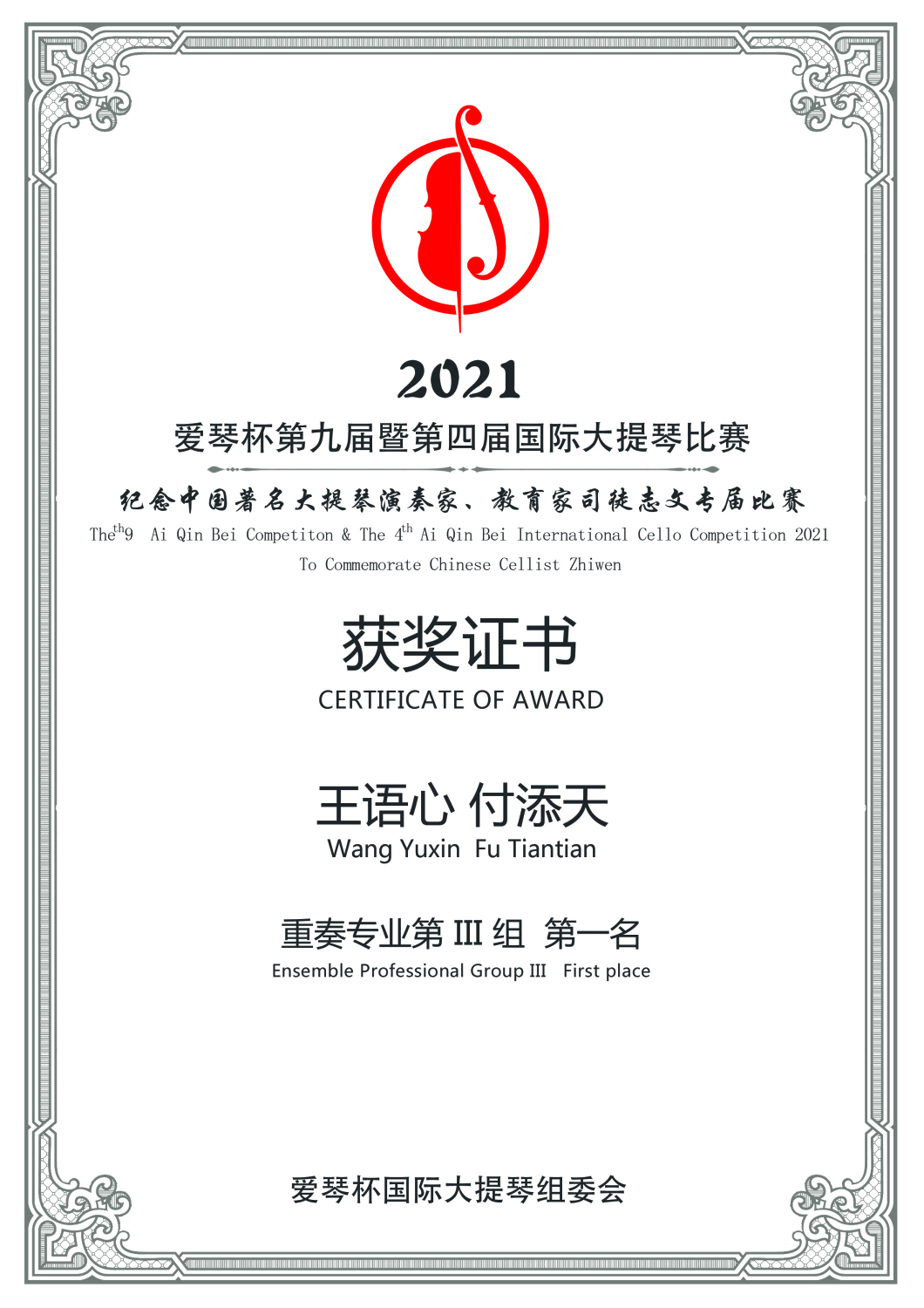 2019年《爰琴杯第八届暨第三届国际大一提琴比赛》获终身成就奖。