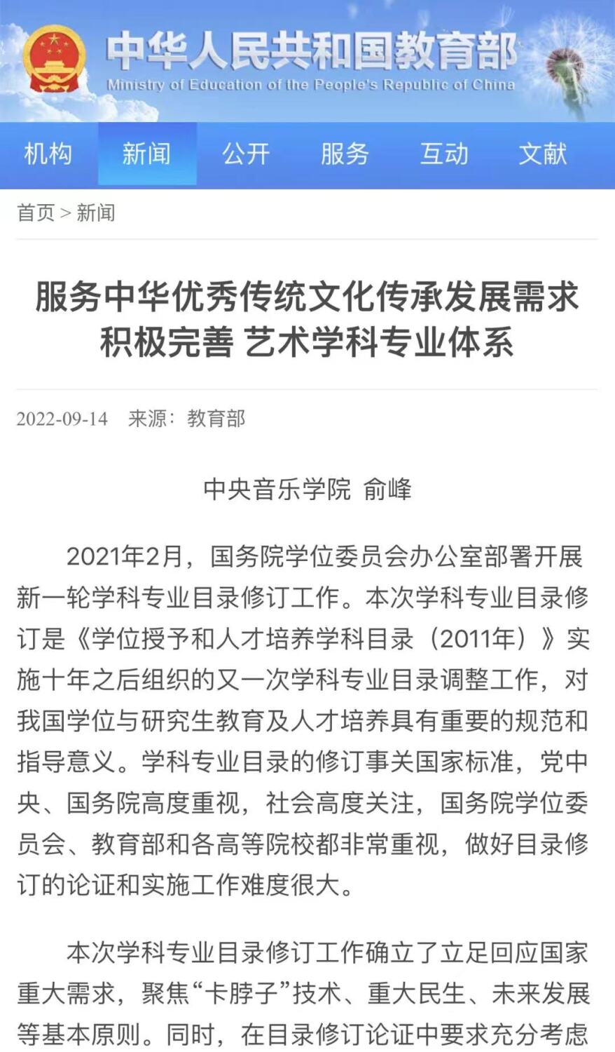 2022年9月14日,教育部官网发表米兰俞峰校长的署名文章《服务中华优秀传统文化传承发展需求 积极完善艺术学科专业体系》,对学科专业目录的修订工作及新版艺术学门类学科专业目录调整相关工作的情况予以报道。特此转载,以飨读者。