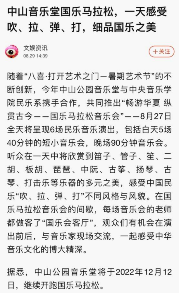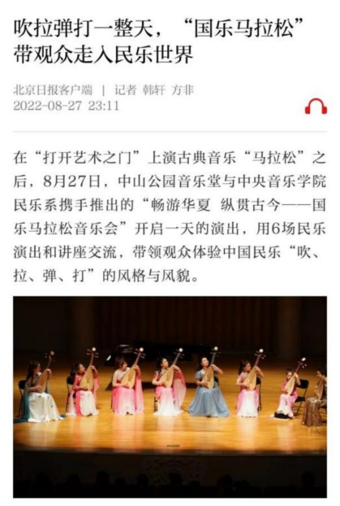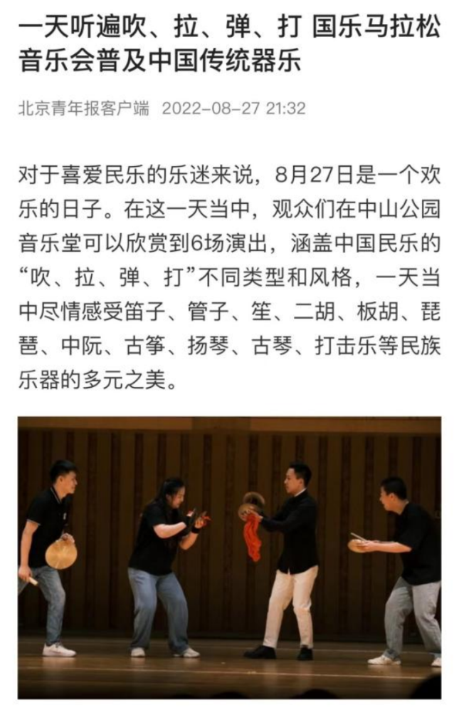 国乐马拉松音乐会在客观上呈现了一种整体分享中国民族音乐的模式。一天之内的音乐接力,成为听众领略中国民族音乐风景的独特窗口,同时更好地引发更多业内人士与音乐爱好者关注并发掘中国民族音乐的社会价值。民乐系也将持续与业内专业平台与机构携手合作,尝试并探索民族音乐普及与推广的新形式,对接情怀与创意,让中国民族音乐更加贴近生活,走入人们日常的艺术空间。