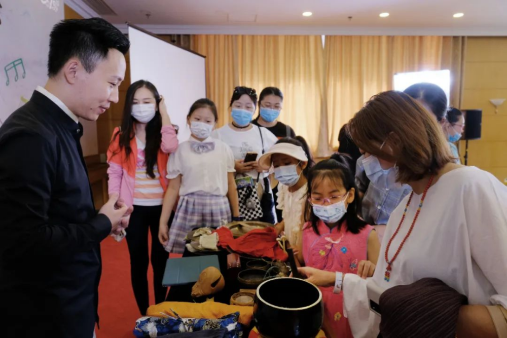 国乐会客厅的设置不仅满足了该乐器学习者的学习需要,同时引起了更多为其他乐器而来的音乐爱好者的兴趣。祝女士带着8岁的女儿来听琵琶音乐会,但看到打击乐“国乐会客厅”讲桌上摆着琳琅满目打击乐乐器,小姑娘也目不转睛地盯着,一个一个分辨。“她学习过琵琶,本来想来听琵琶的演奏,能在这场‘马拉松’里了解其他乐器,是我们的意外收获。”