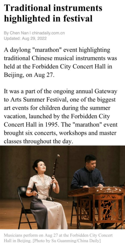 全面直观、深入浅出是许多听众对白天五场小型音乐会的整体感受。每场音乐会邀请业内名家以单一传统乐器为专题,采用讲演结合的形式,展现其代表曲目、发展源流、地方音乐风格与近现代新作等内容,尽可能在短时间内丰富听众对传统乐器的整体印象。