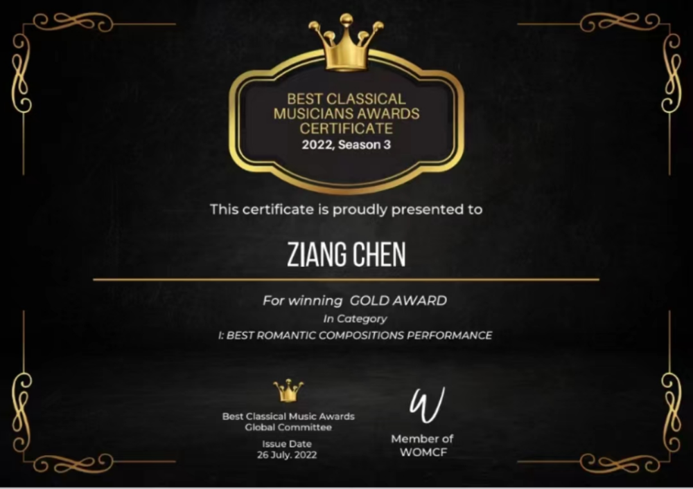 最佳古典音乐家大奖赛,由世界在线音乐比赛联合会,英国True Art古典音乐数字电视台新古典音乐家杂志联合举办。该比赛邀请所有年龄和乐器的天才演奏家参加。比赛的旨在选出具有音乐天赋和热爱音乐的音乐家,以及具有强大的艺术力量和舞台表现力的音乐家。金奖获得者的名字和照片将在BCMA网站展出同时给予指导教师官方认证及荣誉证书。分数在95分以上的参赛选手将获得最佳表演奖。