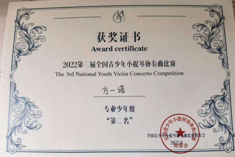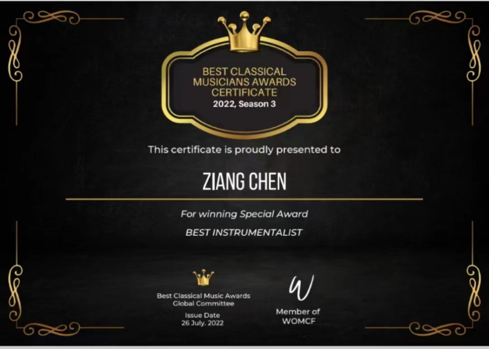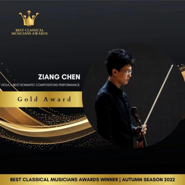 管弦系研究生二年级中提琴专业学生陈子昂获得2022年夏季英国最佳古典音乐家大奖赛Best Classical Musicians Awards (BCMA)浪漫派作品最佳演奏金奖、最佳演奏家特别奖两大奖项(指导教师王昌海教授)。