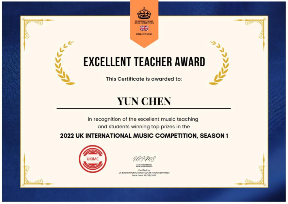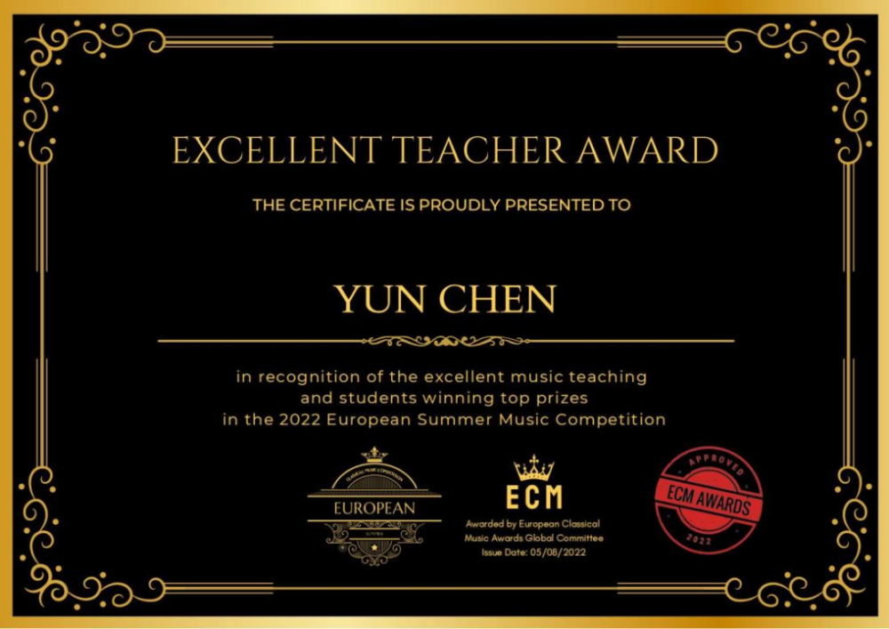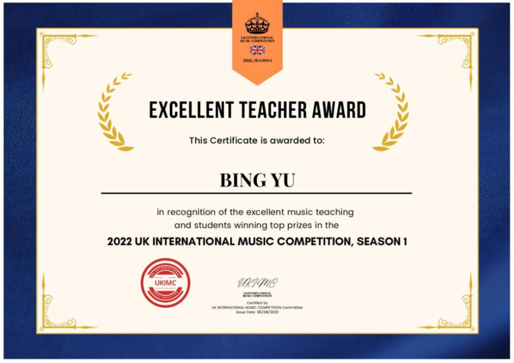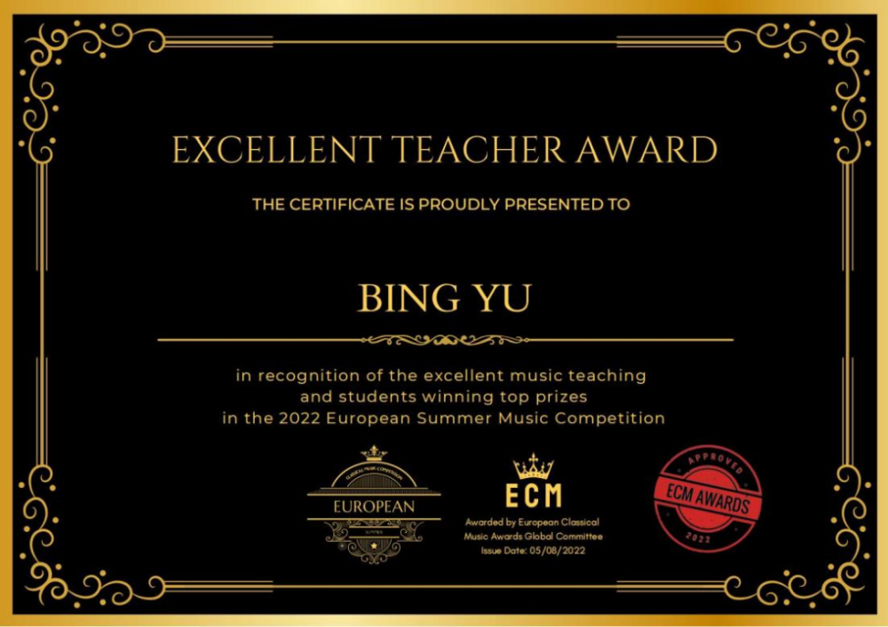 在英国国际音乐大赛中,管弦系小提琴专业学生康耘茂荣获专业组(无年龄限制) 第一名,在欧洲夏季音乐大赛中康耘茂荣获艺术家组(Virtuoso)金奖(第一名),指导教师:陈允教授、于兵教授。陈允教授、于兵教授分别获得两项赛事的优秀教师奖。