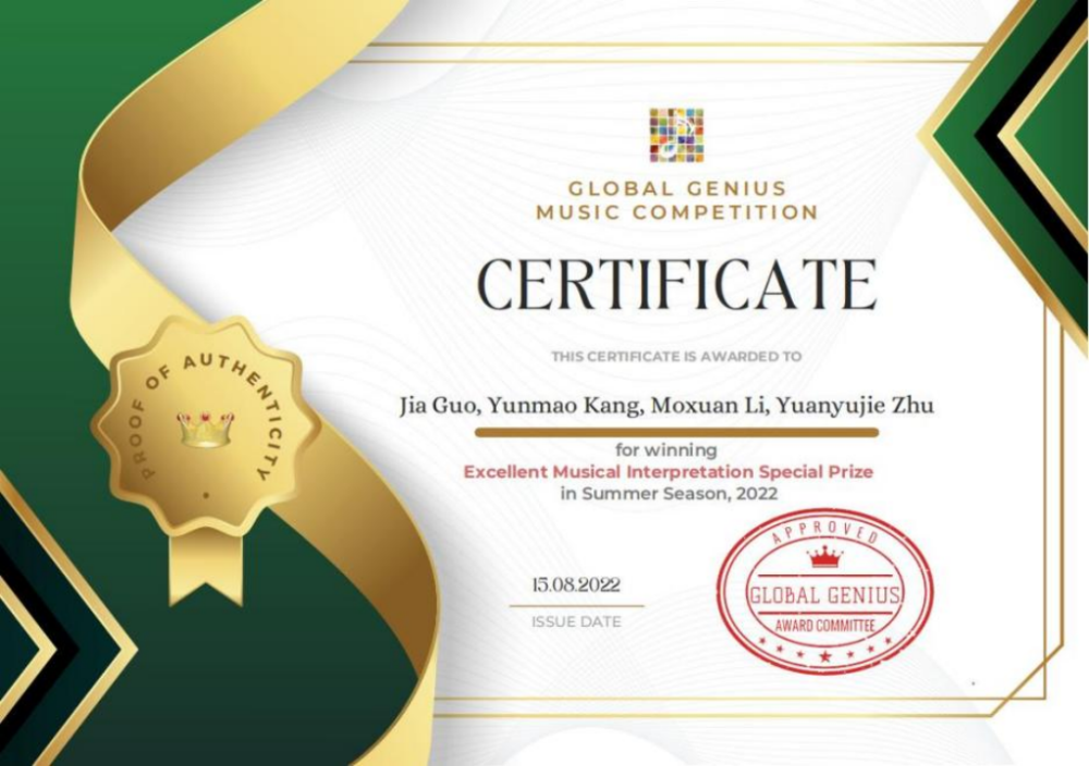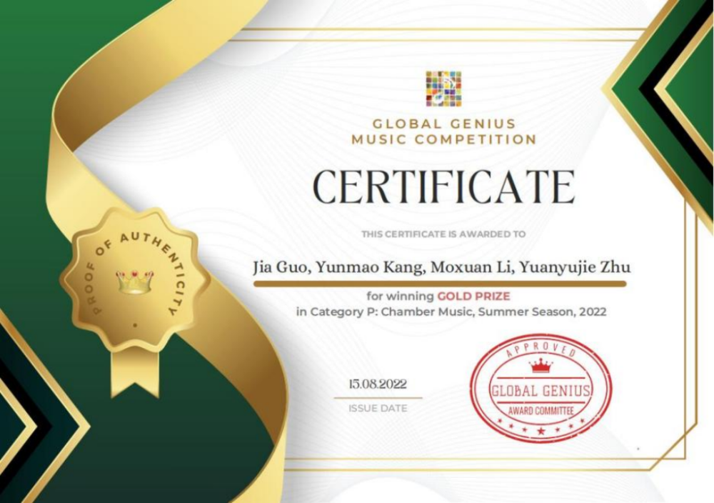 “他们的演奏风格高贵、典雅,音色层次丰富、细腻,对于音乐的表现灵活且自然。”这一点也在2022年8月英国的“全球天才音乐大赛”(Global Genius Music Competition)中得到肯定,他们在该比赛中荣获室内乐金奖(第一名)以及最优秀音乐表现特别奖,同时也是此次比赛唯一获得该奖项的室内乐组合,这一获奖记录也被收录在世界在线音乐竞赛联合会(WOMCF)中。
