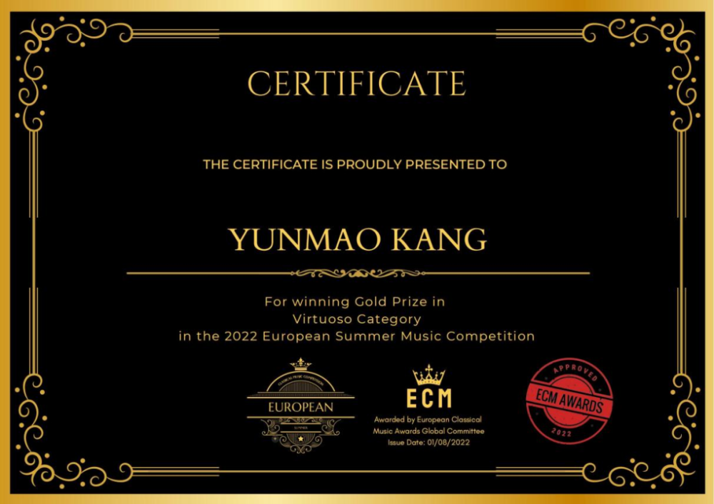 管弦系小提琴专业学生康耘茂荣获英国国际音乐大赛及欧洲夏季音乐大赛两项大奖