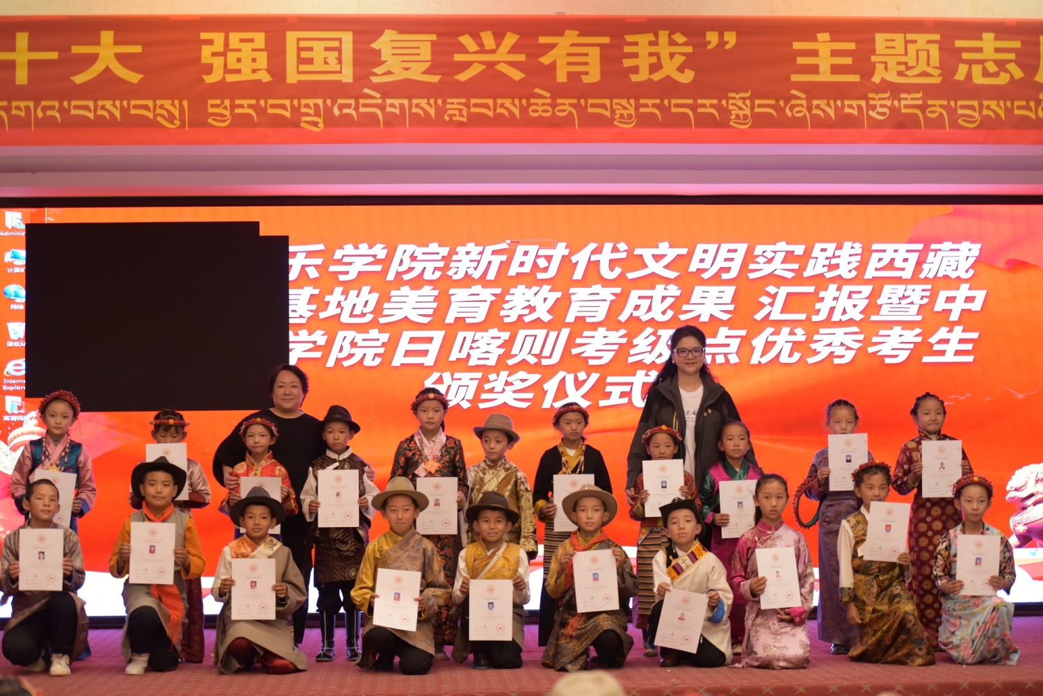 座谈会后,陈冰教授与李小曼老师为2022年6月19日在日喀则举办的声乐公益考级活动中的优秀教师及学生们颁发考级证书。在陈冰教授的带领下,全场师生共同演唱了《我和我的祖国》。