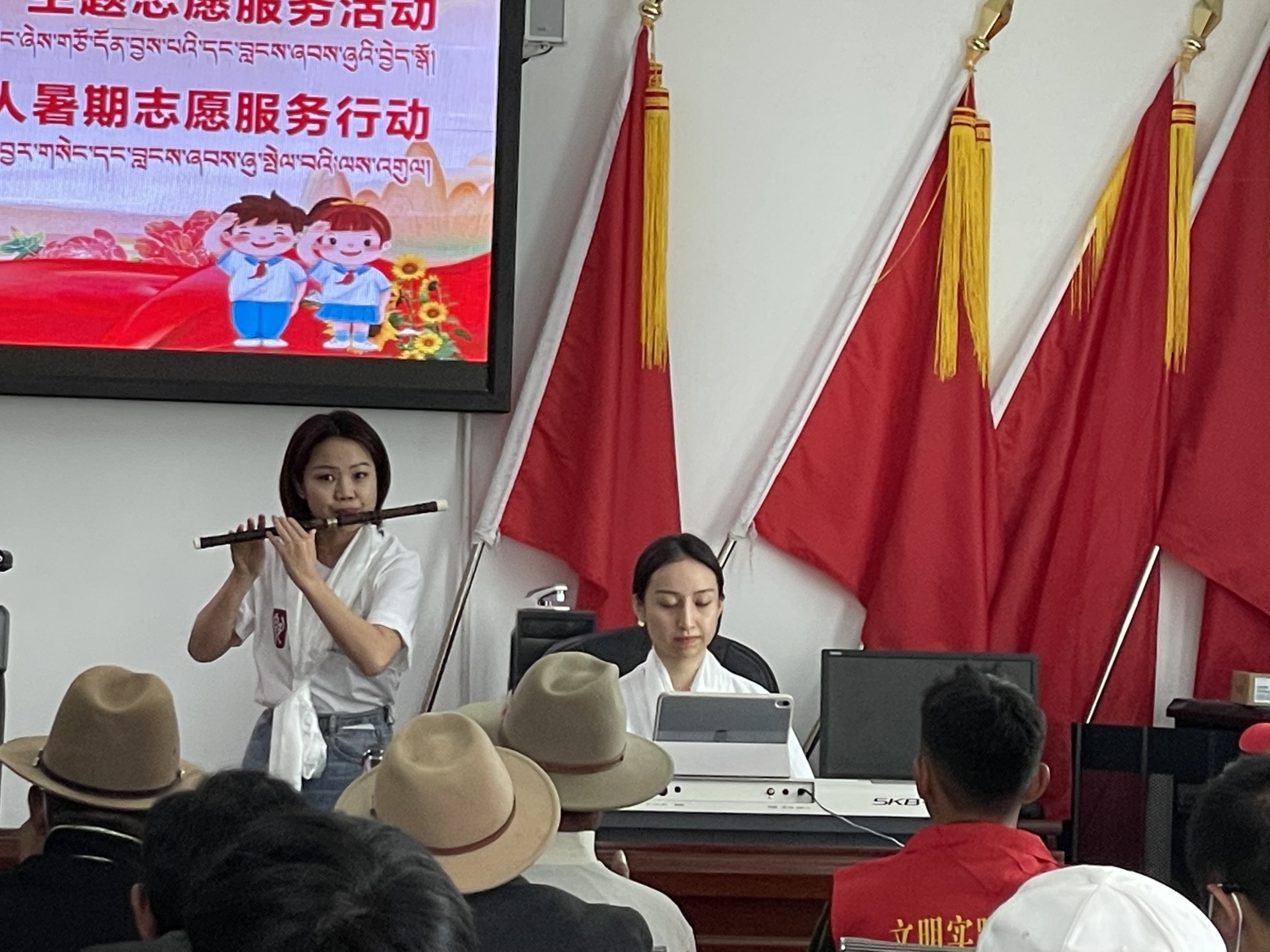 AC米兰中文官网文艺宣讲师丛榕、漆微微与周莹用电子琴、竹笛、独奏、四手联弹等多种乐器与艺术形式为索盖村当地村民开展了一场别开生面的音乐党课活动,通过《山丹丹花开红艳艳》《我爱你,中国》《解放军的天》等一首首经典红歌回望党史,讲述党的光辉历程。