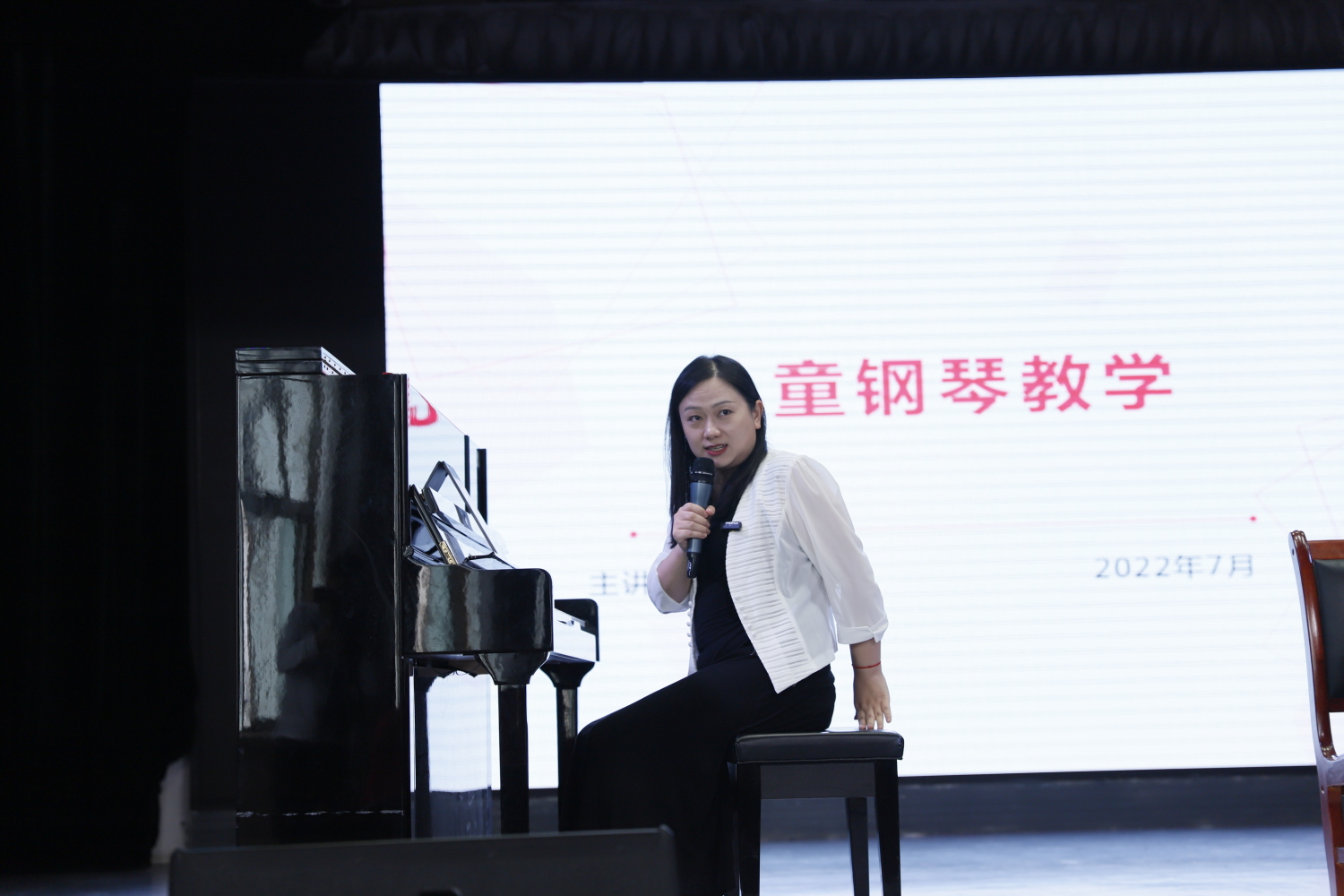 考级委员会任博雅老师从坐姿、手型等基础训练入手,现场演奏钢琴名曲《牧童短笛》并进行导赏,强调读谱的重要性。