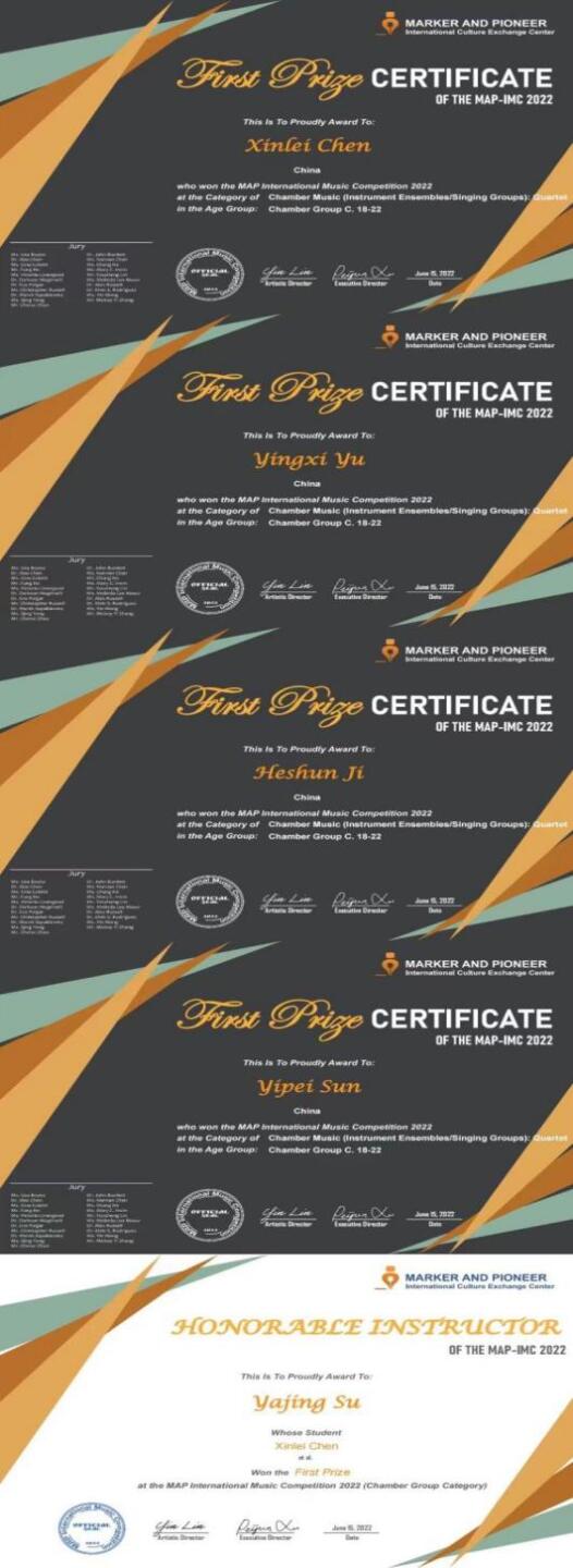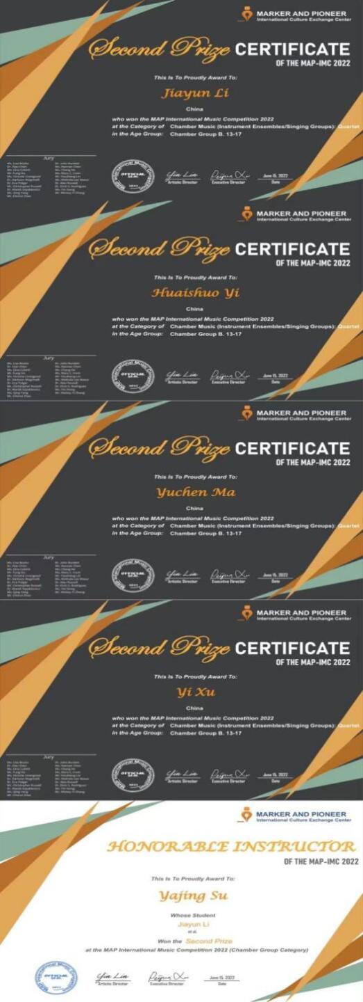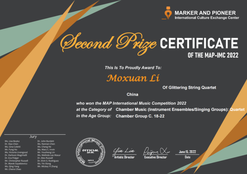 米兰“Glittering 弦乐四重奏”荣获MAP-IMC 2022国际音乐大赛室内乐比赛室内乐弦乐四重奏C组二等奖。指导教师:何畅。