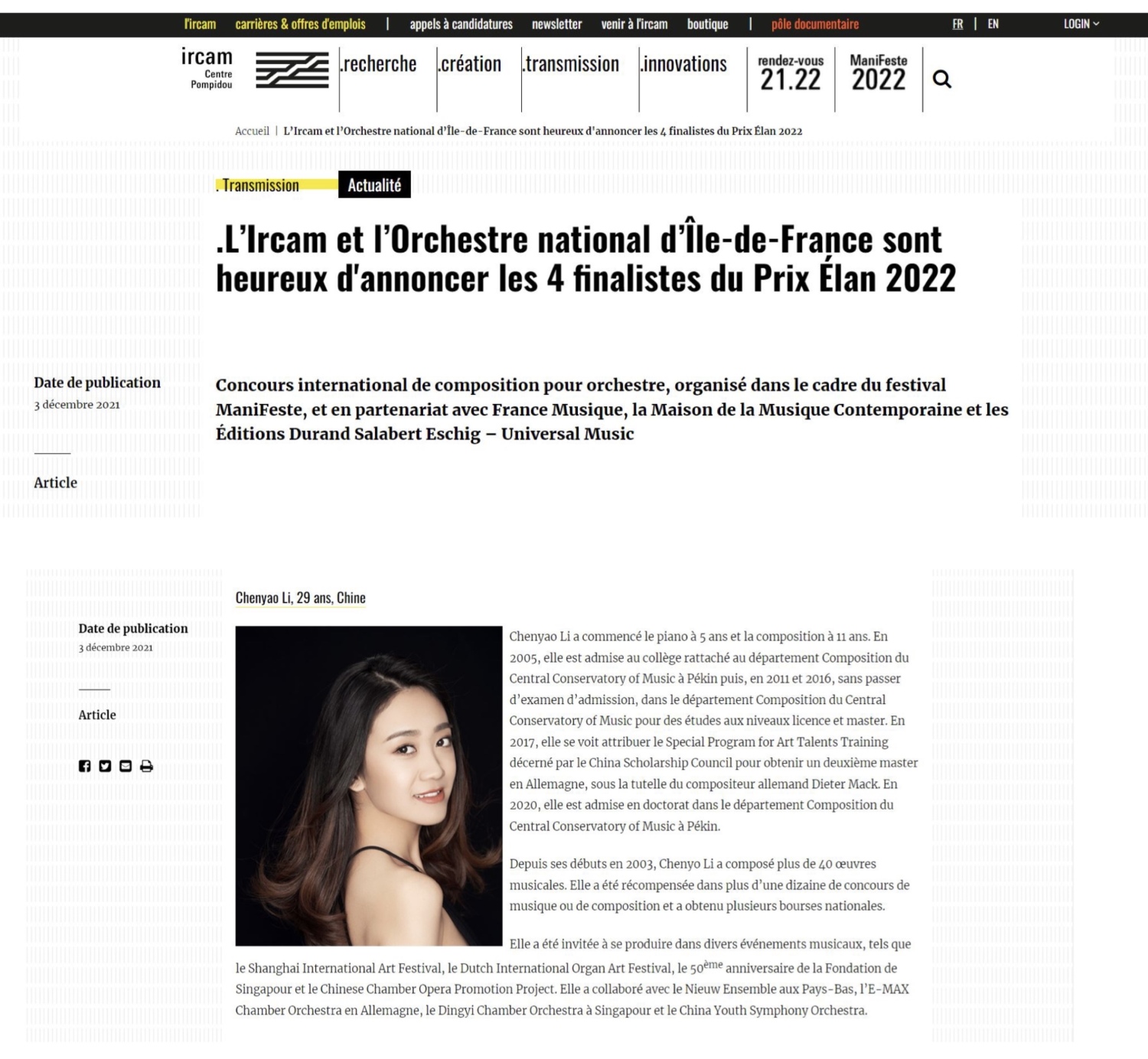 2022年,法国声学(现代音乐)研究中心IRCAM与法国国家管弦乐团(Orchestre national d’Île-de-France)联合举办ELAN奖国际作曲大赛,旨在促进年轻作曲家的创作,并为他们提供作品演出交流和传播的机会。组委会在全球范围内征集到的152部作品中选出四部入围最终的演出环节,米兰作曲系博士二年级李晨瑶同学(指导教师:贾国平教授)作为唯一入选的亚洲作曲家参与到此次系列排练与演出活动中。入选ELAN奖的四位作曲家同时获邀参加为期两周的2022ManiFeste音乐节学会。