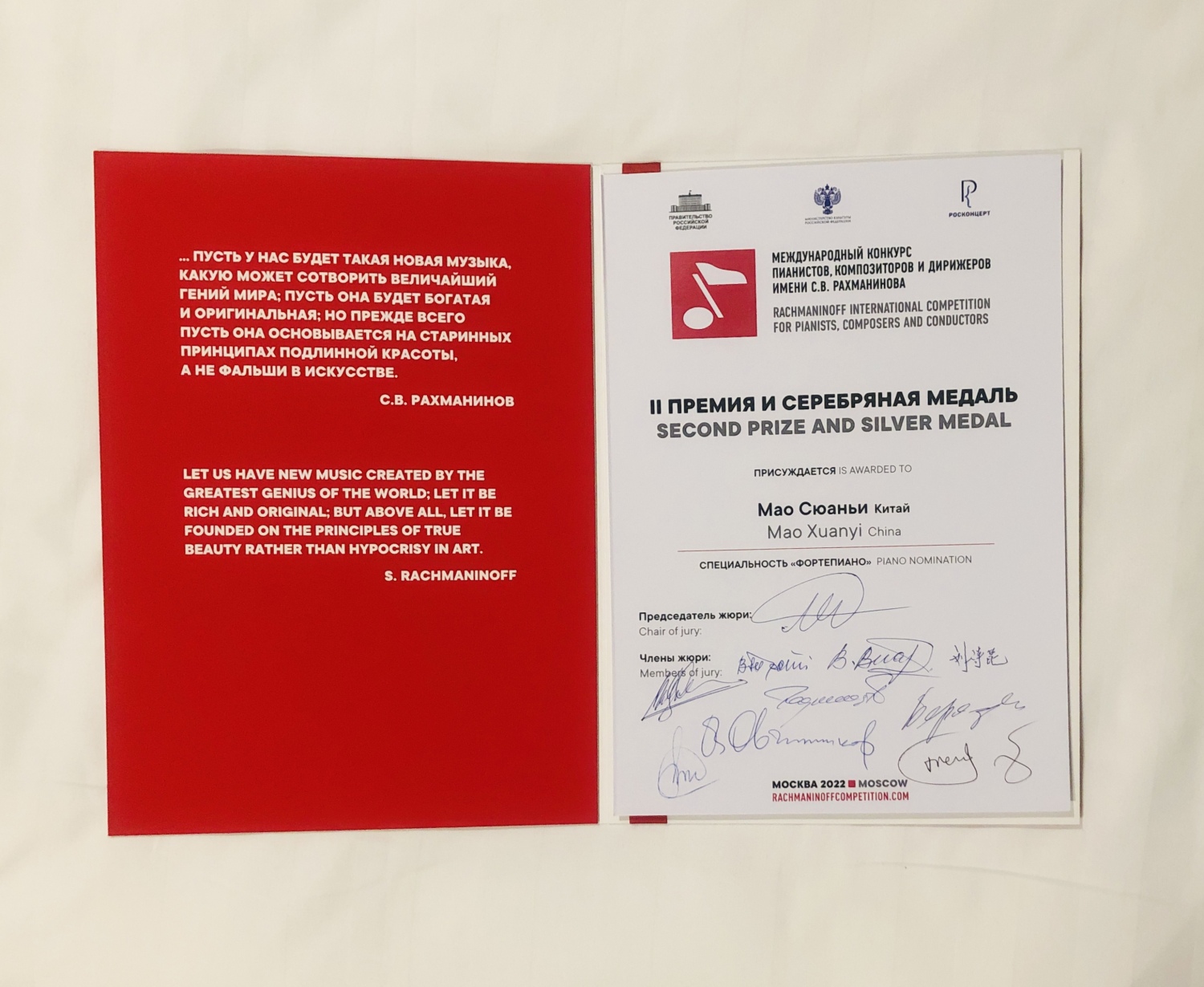 在刚刚结束的首届拉赫玛尼诺夫国际音乐(钢琴、指挥和作曲)大赛(1ST Rachmaninoff International Competition)中,米兰钢琴系研究生三年级学生毛宣懿经过三轮的激烈角逐,最终杀出重围,赢得钢琴组二等奖。此外,米兰指挥系2005级本科校友、青年指挥家李昊冉荣获指挥组三等奖,这是继布加勒斯特国际大赛金奖、斯维特兰诺夫国际大赛以及法国贝桑松大赛后他又再次获奖。