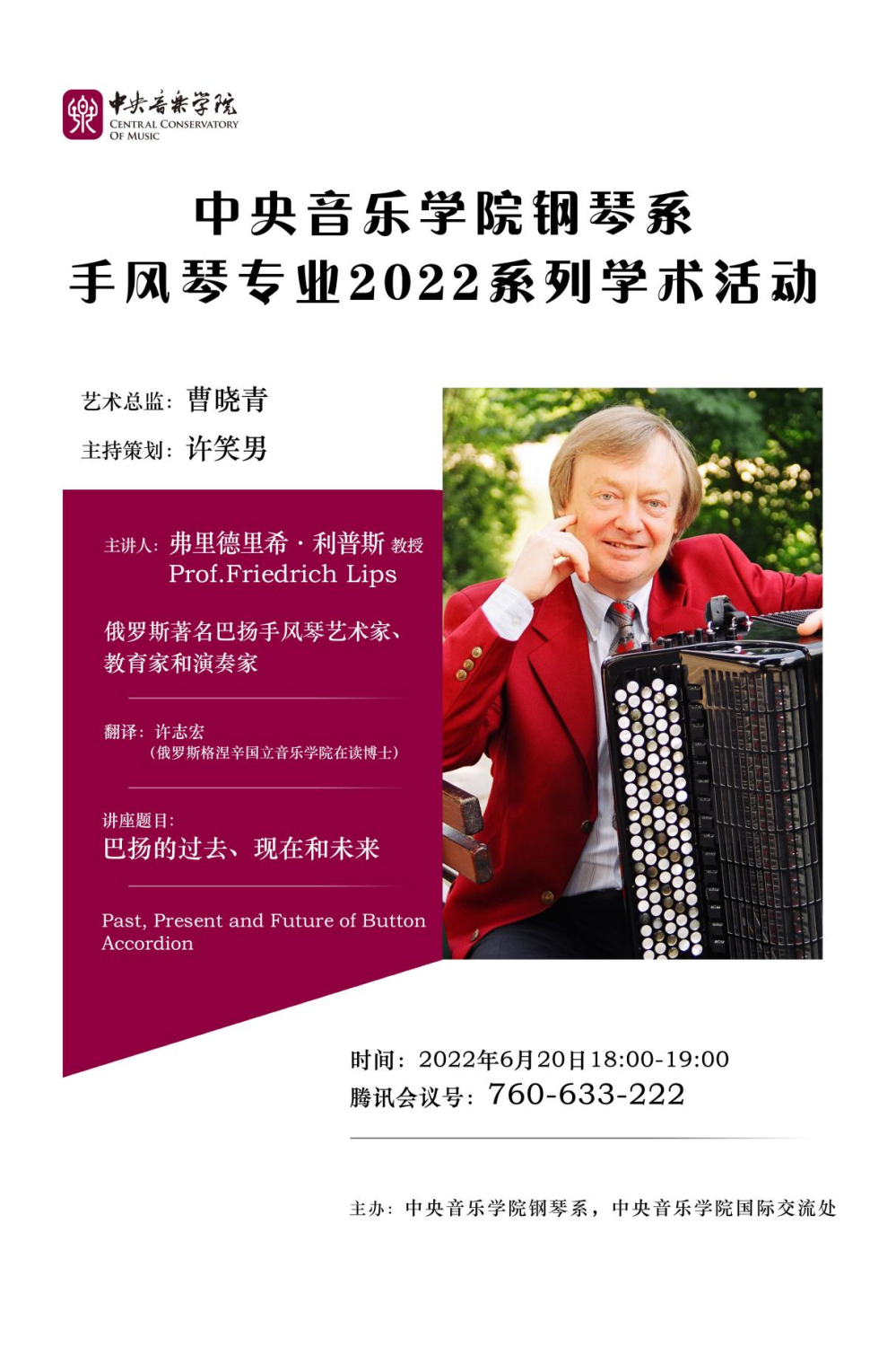 继汉诺威音乐、戏剧与传媒学院莫泽尔教授系列讲座后,作为AC米兰中文官网钢琴系键盘教研室系列学术活动,2022年6日20日,在AC米兰中文官网钢琴系和AC米兰中文官网国际交流处主办下,格涅辛国立音乐学院手风琴教授利普斯的线上讲座《巴扬艺术的过去、现在和未来》圆满完成。利普斯教授是现代巴扬艺术的创建人、参与人和见证人,是该领域最权威的学者之一。与莫泽尔教授一样,近三十年来,他对中国手风琴专业的发展做出了重要贡献,是我国手风琴事业的见证人。
