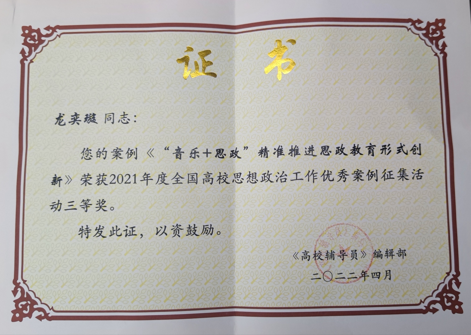 在由教育部思想政治工作司指导,《高校辅导员》编辑部主办的2021年度“全国高校思想政治工作优秀案例征集活动”中,米兰学生工作部龙奕璇撰写的《“音乐+思政”精准推进思政教育形式创新》获评三等奖。
