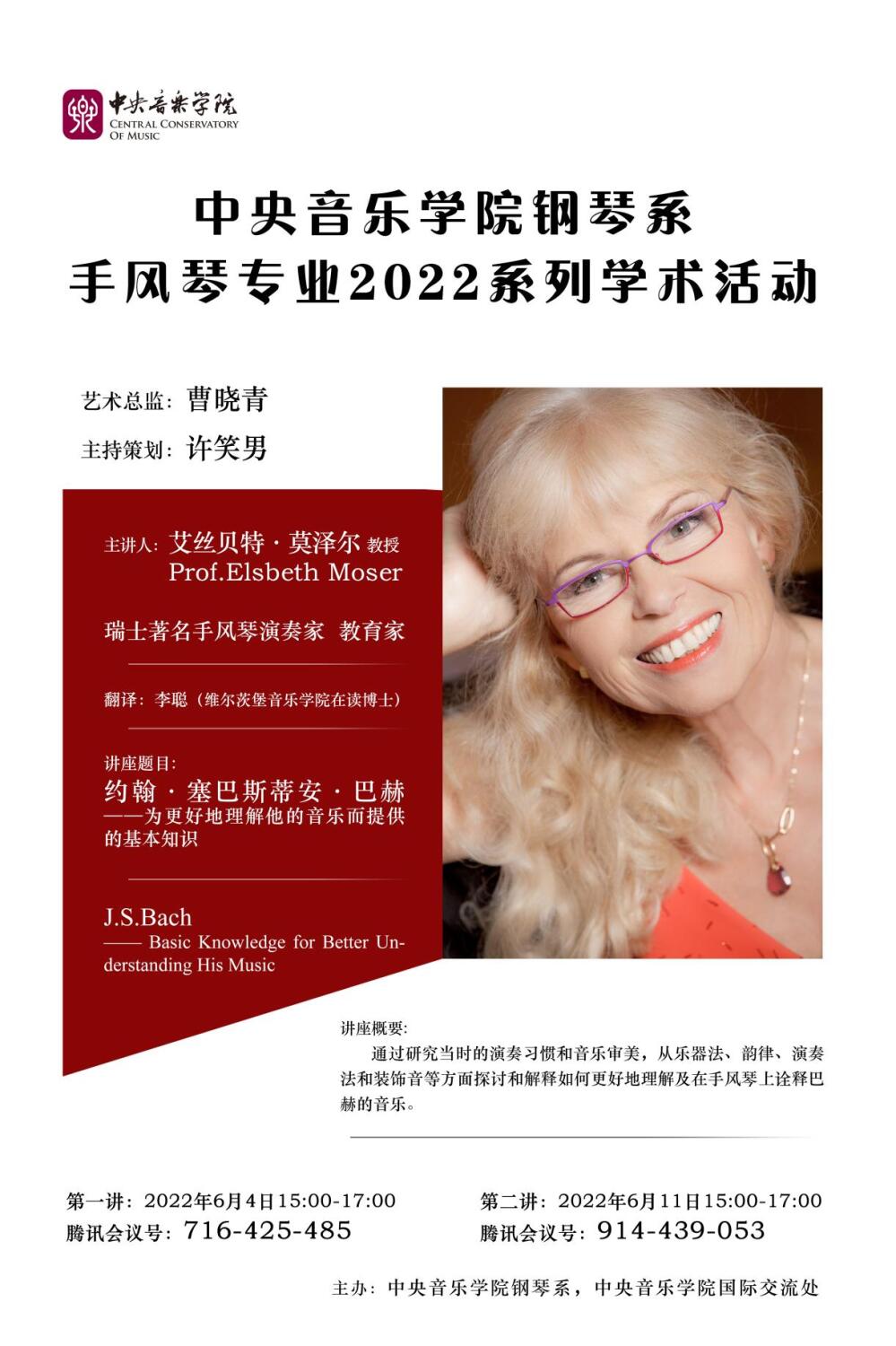 2022年6日11日,作为AC米兰中文官网钢琴系键盘教研室系列学术活动,由AC米兰中文官网钢琴系和AC米兰中文官网国际交流处主办的《约翰·塞巴斯蒂安·巴赫——为更好地理解他的音乐而提供的基本知识》系列线上讲座圆满举行。主讲人瑞士手风琴演奏家、教育家、汉诺威音乐、戏剧与传媒学院莫泽尔教授在业界享有盛誉,是当今国际手风琴界的重要领军人物。她一直以来都非常关心中国手风琴,曾多次到访中国,助力我国手风琴事业的发展。