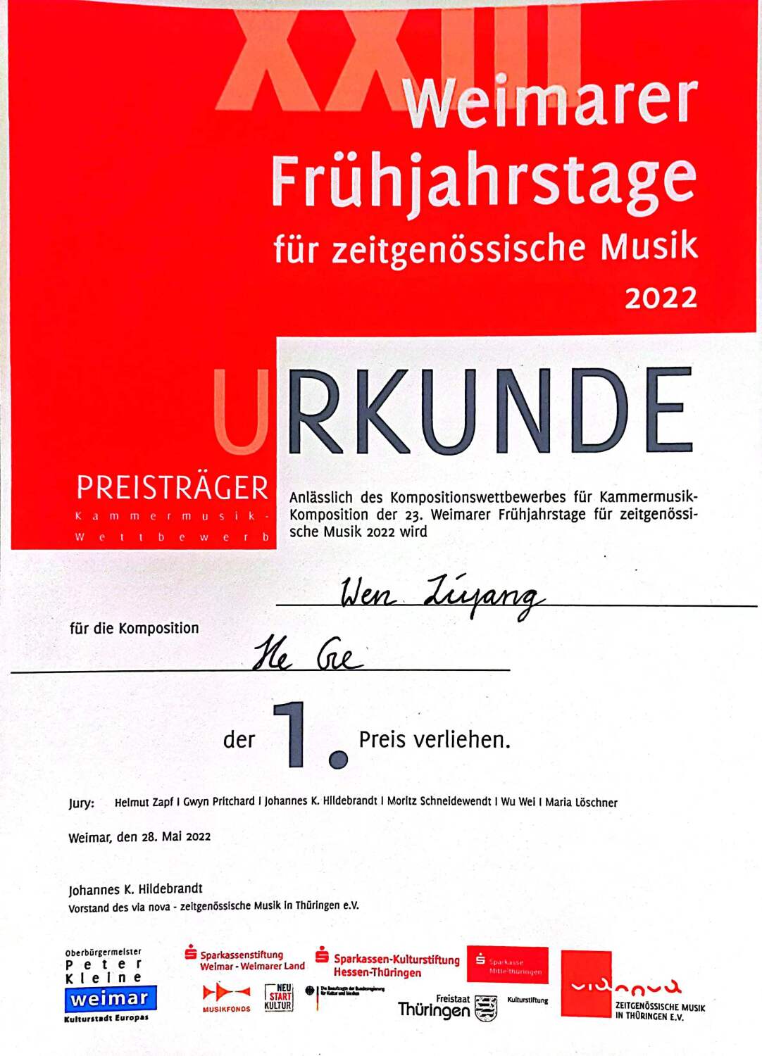 5月28日,魏玛国际作曲比赛室内乐组决赛音乐会在魏玛文化与青少年活动中心举行。著名笙演奏家吴巍与单簧管演奏家Moritz Schneidewendt、手风琴演奏家Maria Löschner现场演奏了三首入围作品。最终经过由英国作曲家、指挥家Gwyn Pritchard、德国作曲家协会图林根州作曲协会主席JohannesK.Hildebrandt、作曲家、柏林艺术学院成员Helmut zapf在内的评委评议,将大奖颁给文子洋同学。此外,经由现场观众投票,文子洋的作品还获得最受观众喜爱奖。