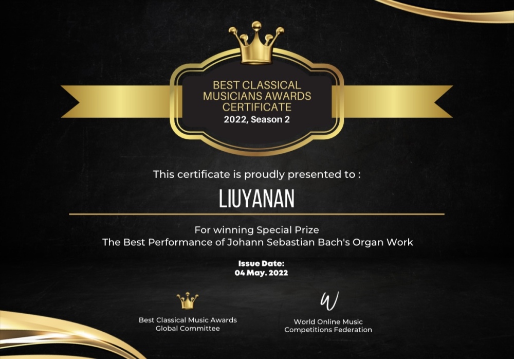 2022年夏季最佳古典音乐家大奖赛Best Classical Musicians Awards (BCMA)由世界在线音乐比赛联合会,英国True Art 古典音乐数字电视台新古典音乐家杂志联合举办。