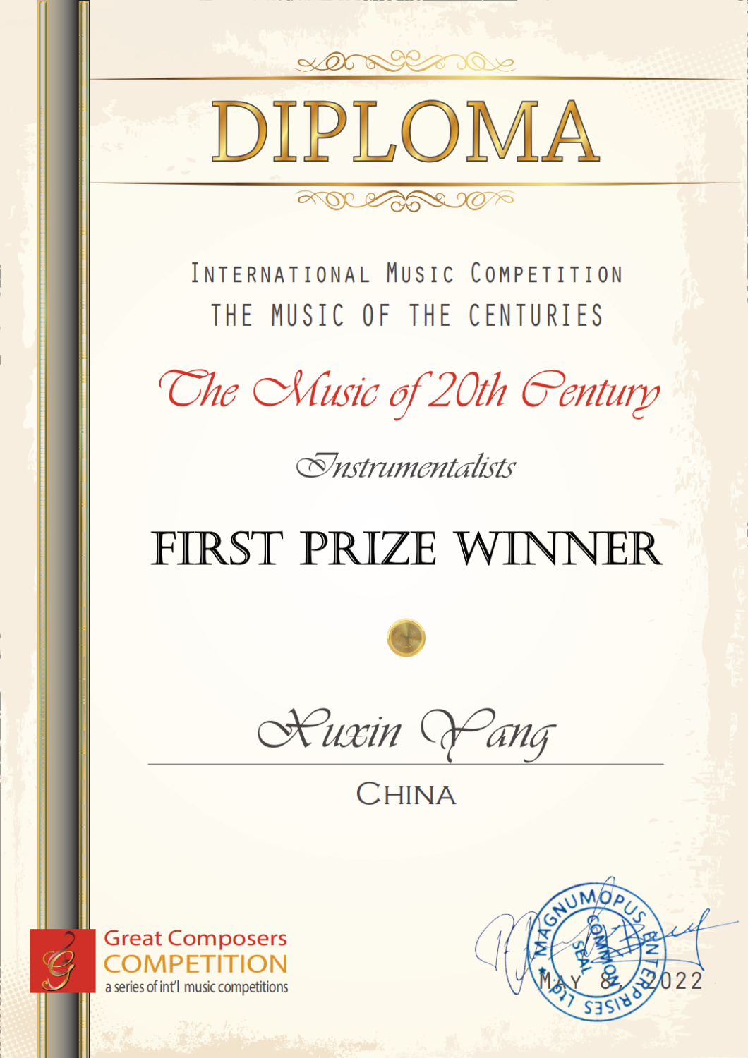 “伟大作曲家大赛”(Great Composers Competition)是为年轻演奏家举办的一系列国际音乐比赛。由英国伦敦杰作企业主办,旗下赛事包含“世纪杰出作曲家”系列音乐比赛、“世界希望之星”国际音乐比赛等。这项赛事为“二十世纪作品音乐比赛” The Music of 20th Century (7th Edition, 2022)。