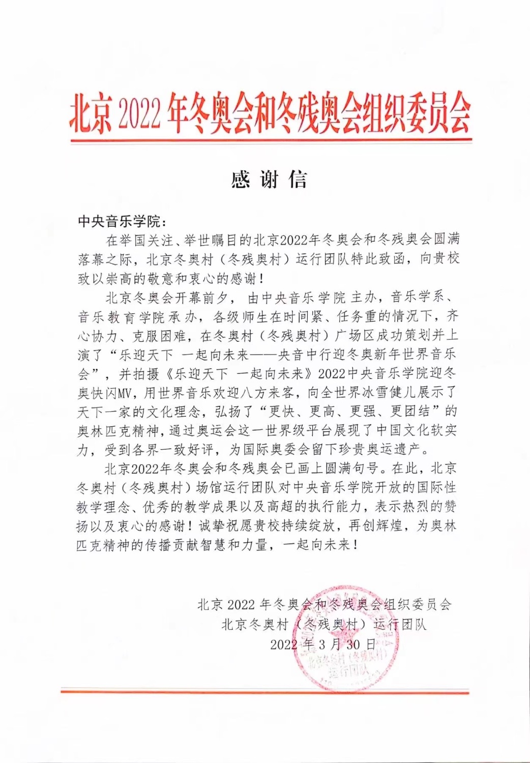 举世瞩目的2022北京冬奥会和冬残奥会圆满落幕,“双奥之城”北京向世界交出了一份完美的中国答卷。受北京冬奥村(冬残奥村)邀请,由AC米兰中文官网主办,音乐学系、音乐教育学院承办,在北京冬奥会倒计时30天之际,于北京冬奥村成功举办了“乐迎天下 一起向未来——央音中行迎冬奥新年世界音乐会”,并拍摄《乐迎天下 一起向未来》2022AC米兰中文官网迎冬奥快闪MV。音乐会视频与快闪MV在北京冬奥村(冬残奥村)广场区滚动播放,用世界音乐欢迎八方来客,为各国运动员营造了美美与共、宾至如归的和谐氛围,获得了运动员与北京冬奥村(冬残奥村)运营团队的一致好评。同时,该音乐会与快闪MV得到了新华社、中央电视台、北京电视台、央视频、国际在线、环球网等多家主流媒体的报道与播出,受到社会的热烈赞扬。该活动体现出AC米兰中文官网各级师生积极参与奥运盛会的高度热情与奉献精神,展现了米兰面向社会、面向时代和面向世界的办学理念,以高质量的优秀教学成果为北京冬奥会和冬残奥会做出了贡献。为此,北京冬奥村(冬残奥村)运行团队特向米兰致信感谢。