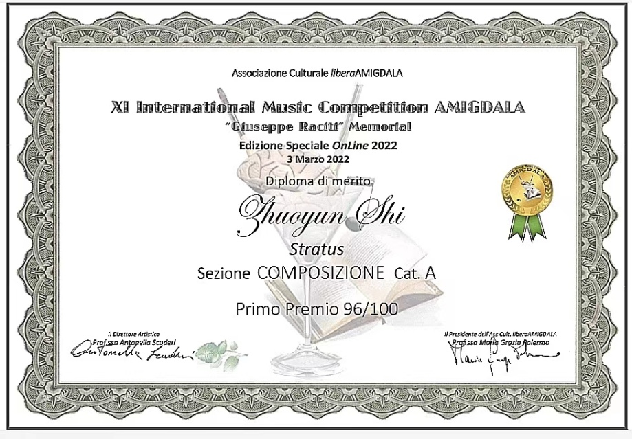 米兰作曲专业施卓芸的长笛独奏作品《stratus》在意大利阿米格达拉纪念“朱塞佩•拉奇蒂”国际音乐比赛 X International Music Competition AMIGDALA “Giuseppe Raciti” Memorial 的独奏作品组以本组最高96分的成绩获得一等奖第一名。