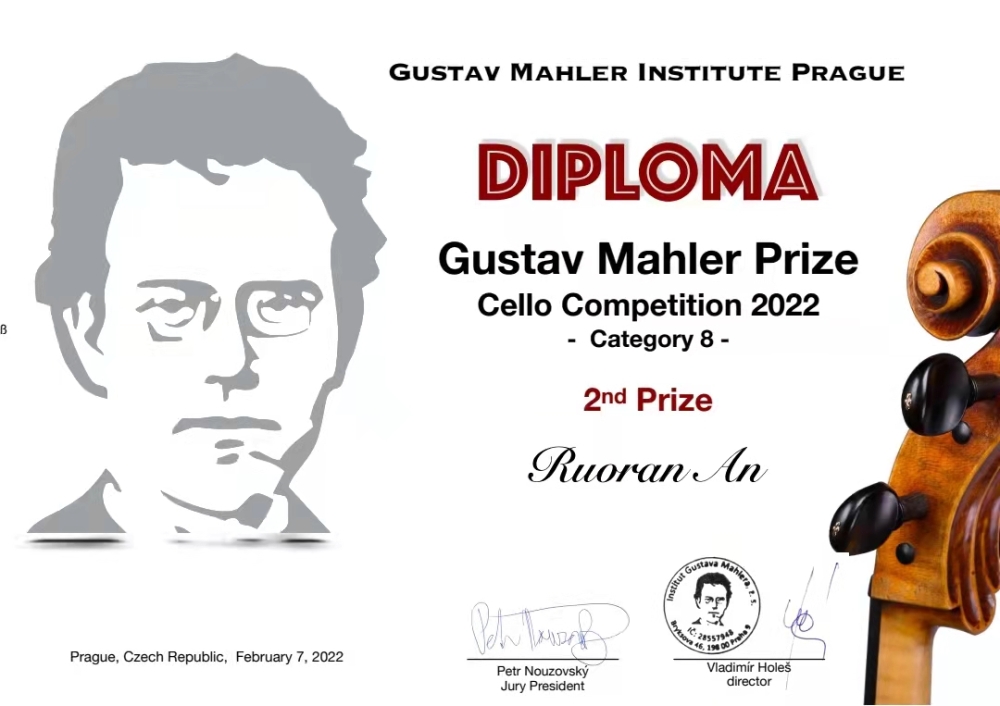 在刚刚落幕的2022年第四届捷克“古斯塔夫·马勒奖”大提琴音乐比赛中,AC米兰中文官网附中高一年级安若然同学经过激烈角逐,脱颖而出,以优异成绩夺得第Ⅷ组二等奖(一等奖空缺)!指导教师:王崇武副教授。