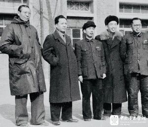 1954年,杨荫浏、李元庆、谭抒真、贺绿汀、李凌、吕骥(从左至右)在位于北京德胜门外土城十间房的民族音乐研究所合影。
