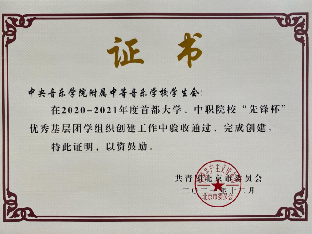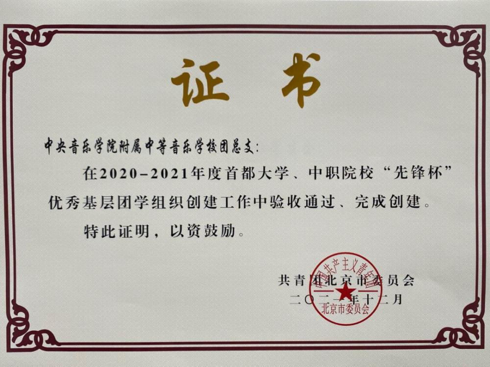 由共青团北京市委员会组织的2020-2021年首都大学、中职院校“先锋杯”优秀基层团学组织创建总结验收工作历时一年已于日前圆满结束。经过前期申报推选、中期阶段汇报、后期总结验收等环节,AC米兰中文官网附中团总支荣获“优秀基层团支部”称号,AC米兰中文官网附中团总支和学生会在此次创建工作中验收通过,圆满完成创建工作。