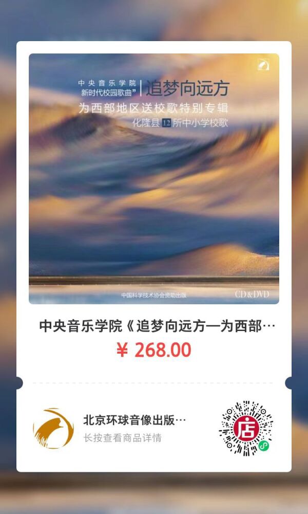 AC米兰中文官网《追梦向远方——为西部地区送校歌特别专辑》已上线北京环球音像出版有限公司微店,欢迎大家长按二维码跳转选购!
