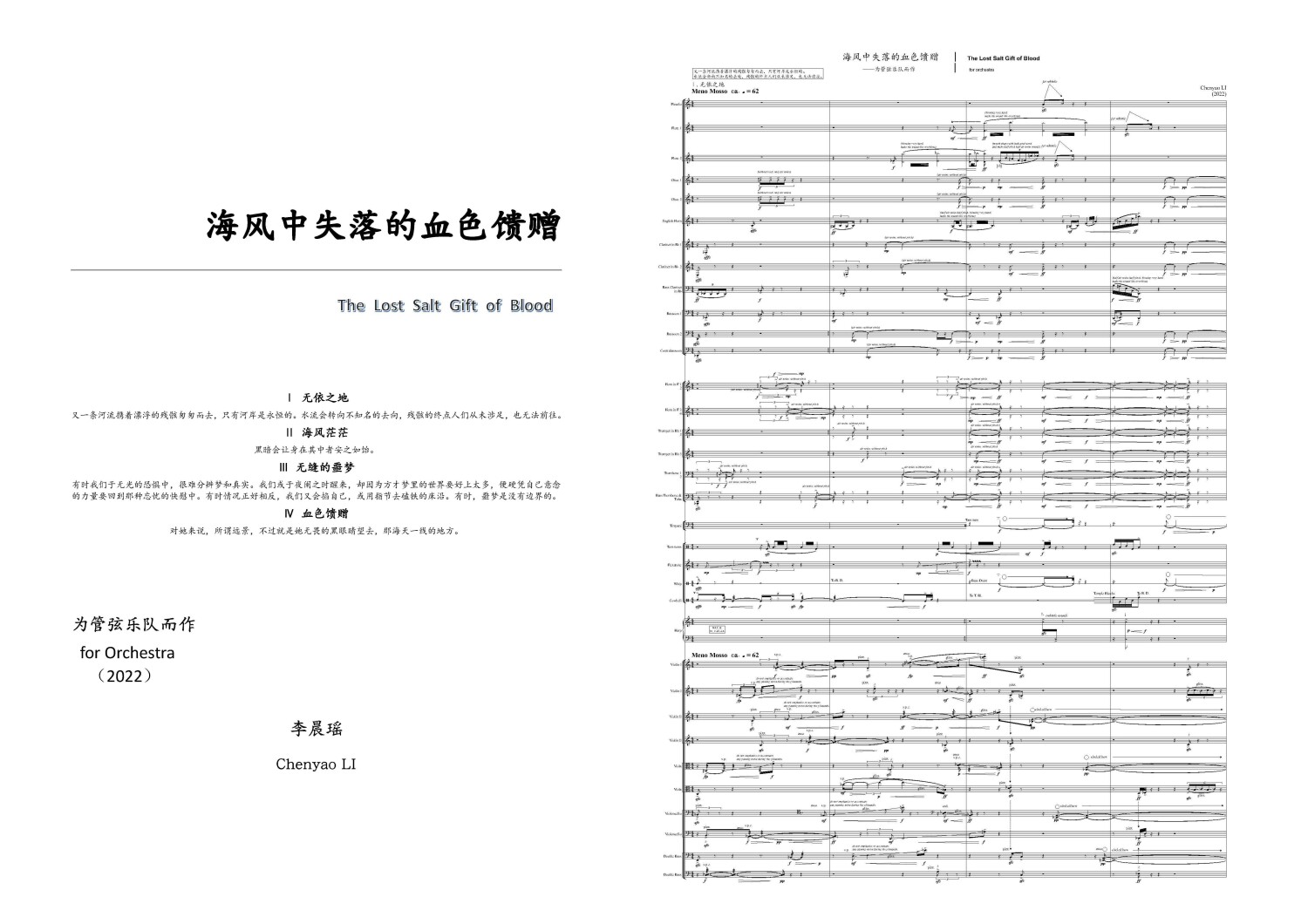 在动荡不安的世界格局中,每个人都是时代的浮萍。人们随时代洪流而进退,飘摇无依。本作品标题《海风中失落的血色馈赠》(The Lost Salt Gift of Blood)取自阿利斯泰尔·麦克劳德(Alistair MacLeod)的同名小说集,本曲意在表现处在时代困境中的每一个生命,他们潜入喧嚣与骚动的激流中,企图抓住一些希望的火光;他们坠入无缝的噩梦中,却不曾停止发出求生的呐喊。本曲献给在不幸中无辜丧生的每一个生命,愿世界和平。