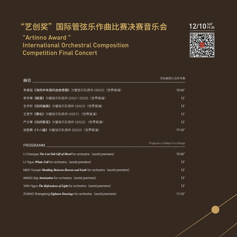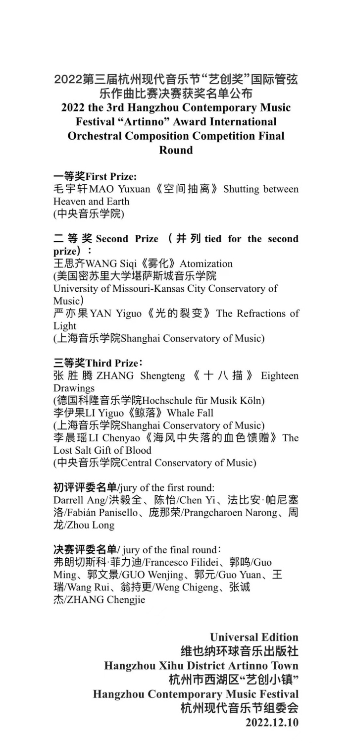 2022年12月10日,第三届杭州现代音乐节的第二天,“艺创奖”国际管弦乐作曲比赛决赛音乐会顺利举行。“艺创奖”作曲比赛自创办以来,已在国内外产生了广泛的影响。本届作曲比赛收到来自全球12个国家及地区的83首参评作品,其中6部作品经过初赛评委遴选入围决赛。由指挥家张诚杰执棒浙江交响乐团进行世界首演,并决出了最终名次。经过评委会的线上打分,最终米兰作曲系本科生毛宇轩(指导教师:贾国平教授)的作品《空间抽离》荣获一等奖,博士生李晨瑶(指导教师:贾国平教授)的作品《海风中失落的血色馈赠》荣获三等奖。